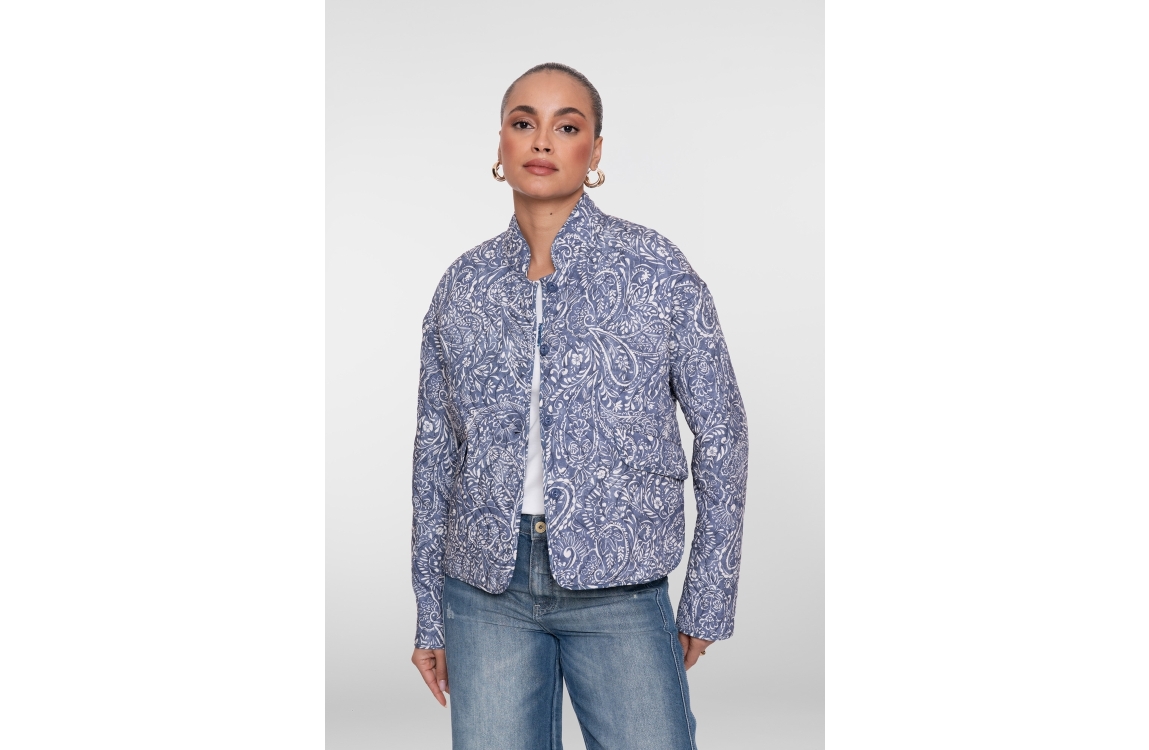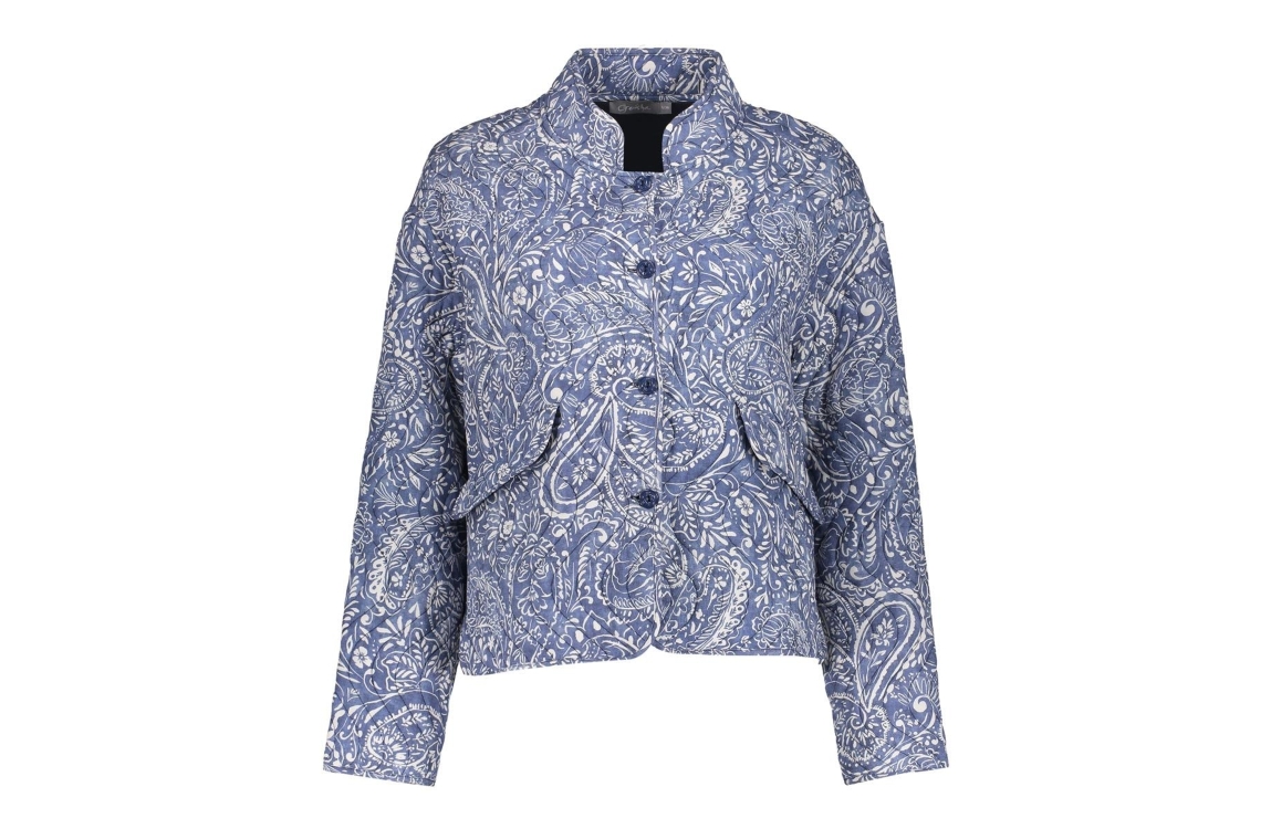 Geisha jacket 65107-70. Dit rechtvallend model is voorzien van een ronde hals en heeft lange mouwen. Dit blauwe jasje van Geisha sluit door middel van knopen en beschikt over twee klepzakken. Dit model is bewerkt met een witte paisley print.