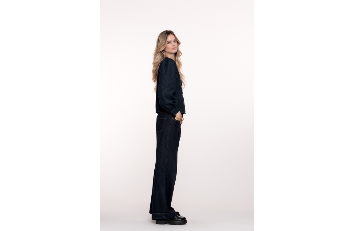 Geisha broek 51521-10. Dit wijdevallend model sluit door middel van knoop en ritsaansluiting en heeft ceintuurlussen. Deze Donker blauwe denim Geisha broek beschikt over twee steekzakken aan de voor- en achterijzde.