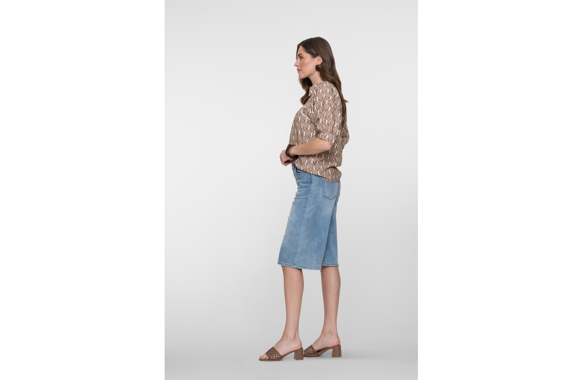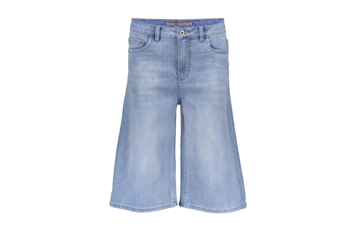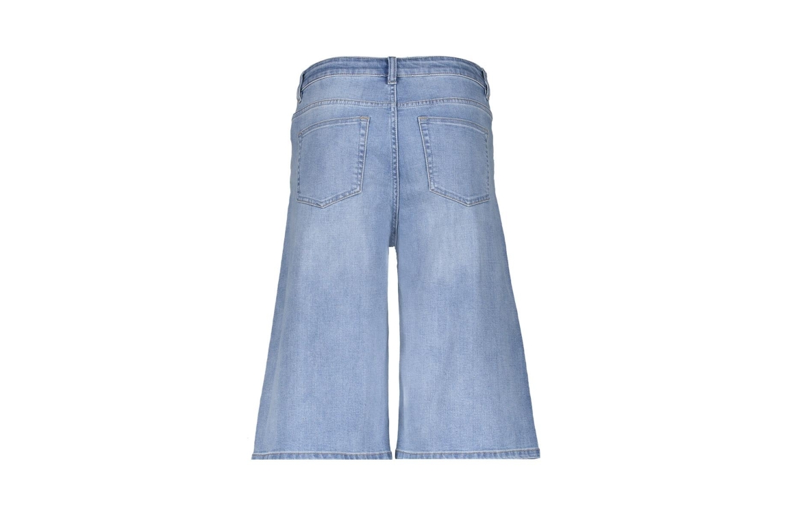 Geisha Jeans short long 835 Stonebleach denim. Dit rechtvallende model is sluit door middel van een knoop en rits sluiting. Deze blauwe bermuda van Geisha is voorzien van steekzakken aan de voor- en achterzijde. Dit model heeeft wijde, ruimvallende pijpen en valt op de knie.