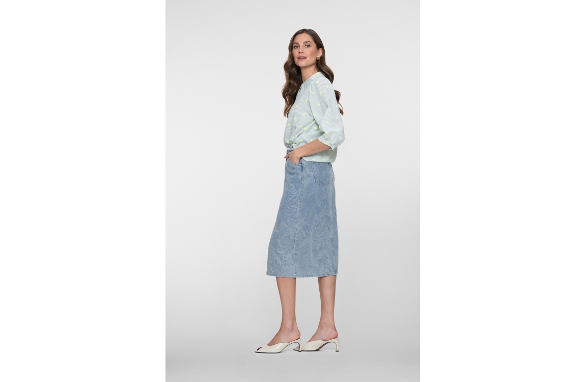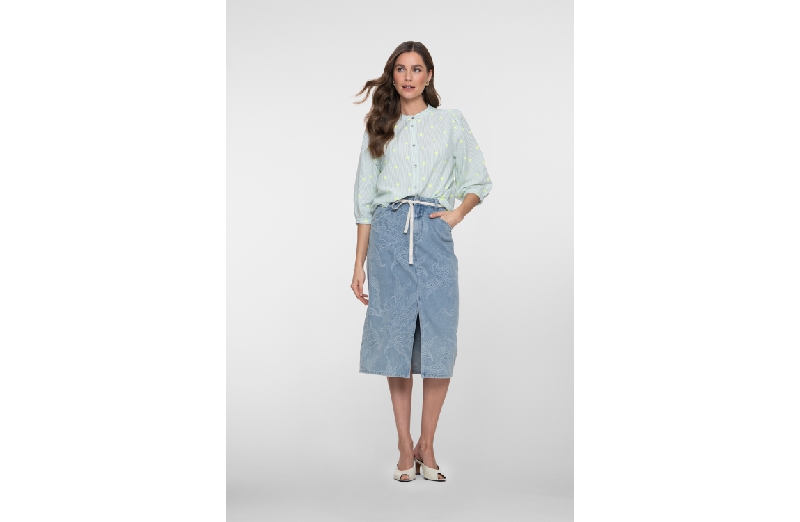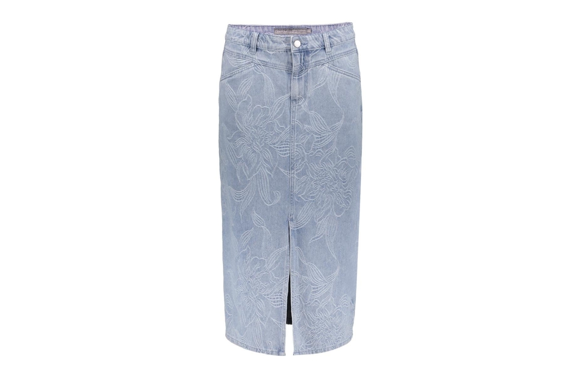 Geisha Jeans skirt jacquard flower 830 Bleached denim. Dit rechtvallende model sluit door middel van een knoop en rits met veterceintuur. Deze denim rok van Geisha beschikt over een split aan de voorzijde en is bewerkt met een jacquard bloemenstructuur.