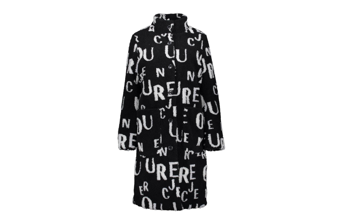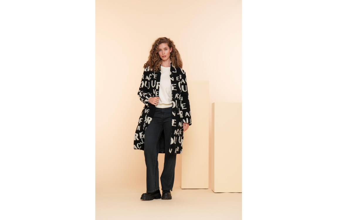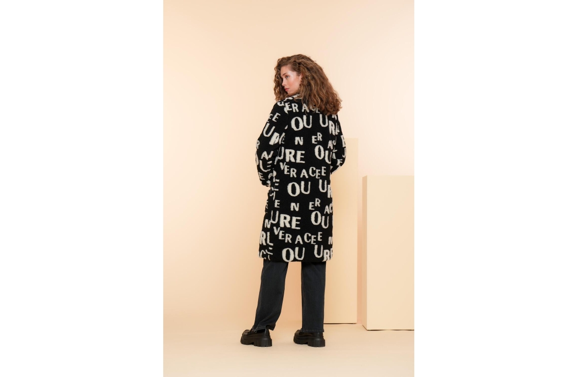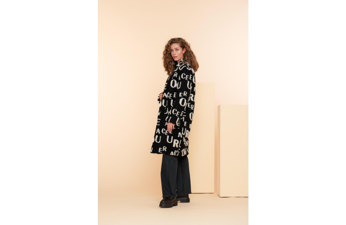 Geisha online jas. Dit rechtvallende model heeft een opstaande kraag en lange mouwen. Deze zwarte jas van Geisha is gemaakt in teddy stof en heeft steekzakken. Heeftg een all-over letter print en is gewatteerd.