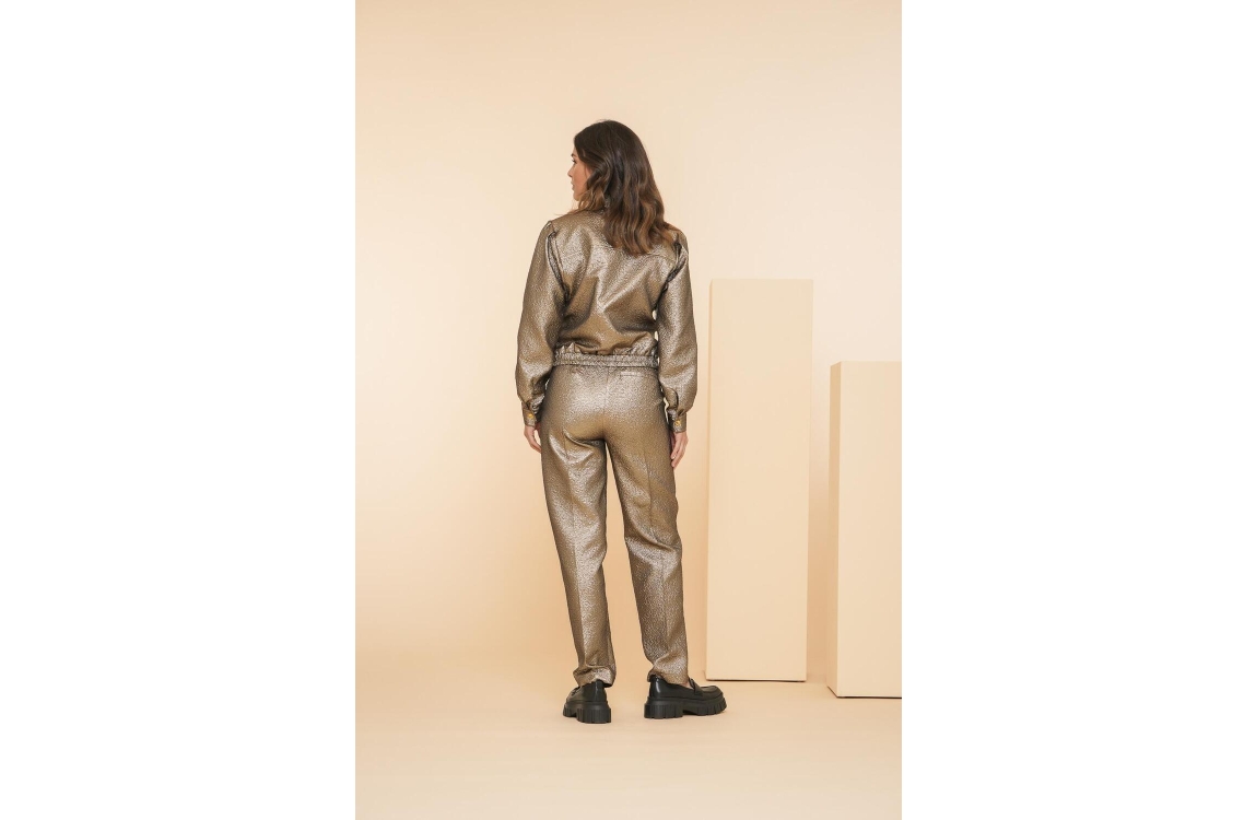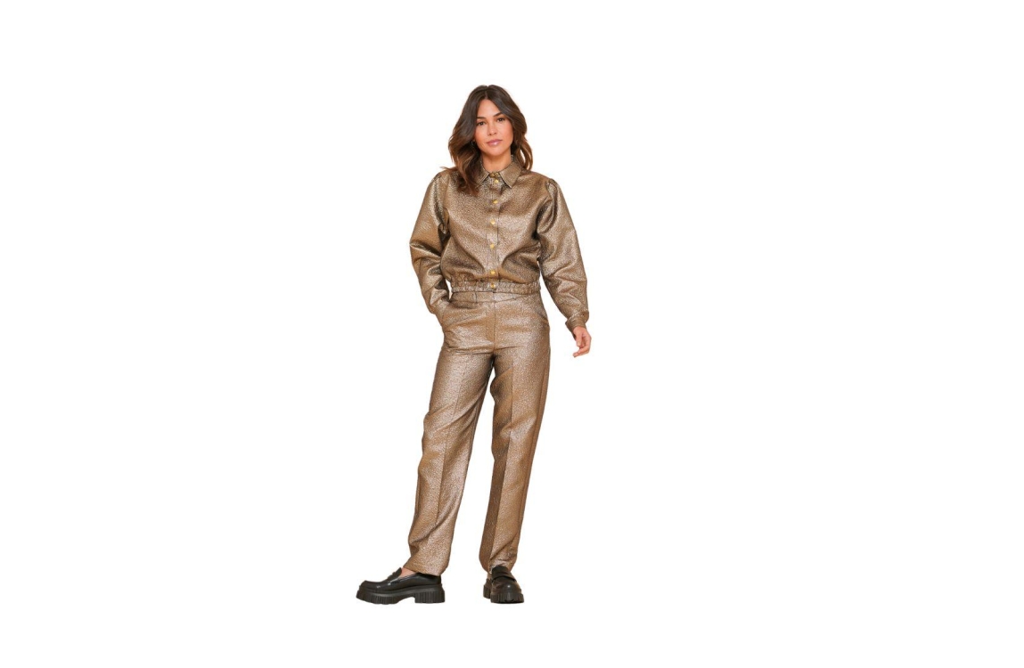 Geisha Online broek 41666-20 000025. Dit regular fit model sluit door middel van een (schuif) knoop en rits met ceintuurlussen. Deze goudkleurige broek van Geisha heeft recht uitlopende pijpen en is all-over bewerkt met een metallic look. Dit model beschikt over twee steekzakken aan de voorzijde en twee paspelzakken aan de achterzijde.