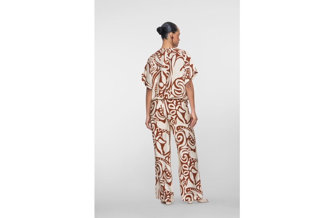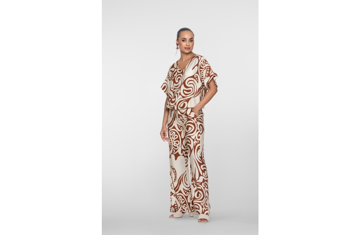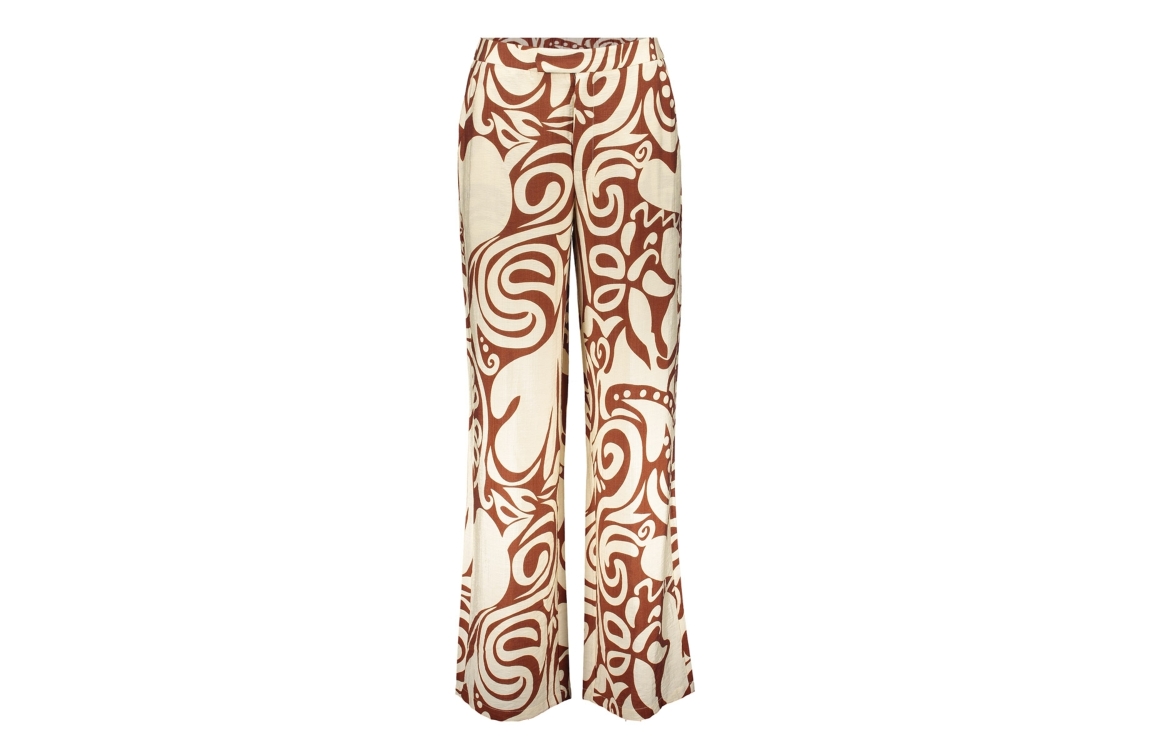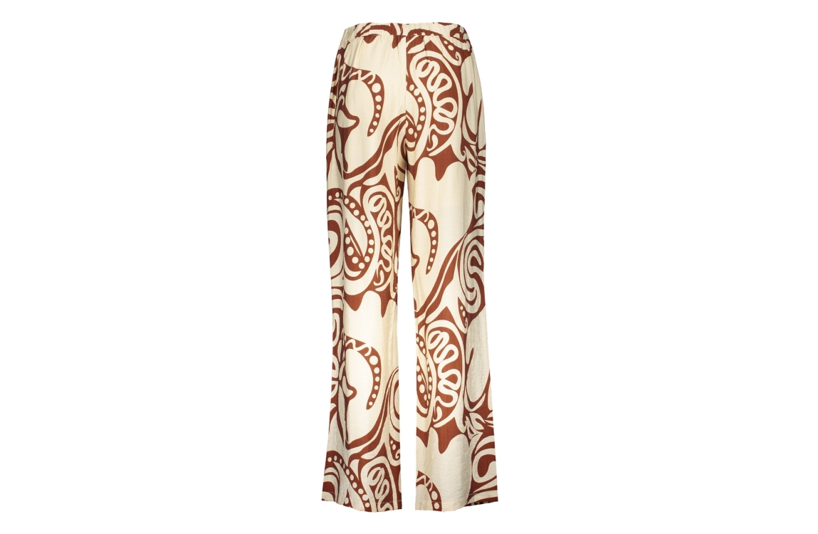 Geisha broek 61401-26 760. Dit wide fit model sluit door middel van een knoop- en ritssluiting. Deze ecrukleurige broek van Geisha is all-over bewerkt met een grafische print en is voorzien van twee steekzakken aan de voorzijde.