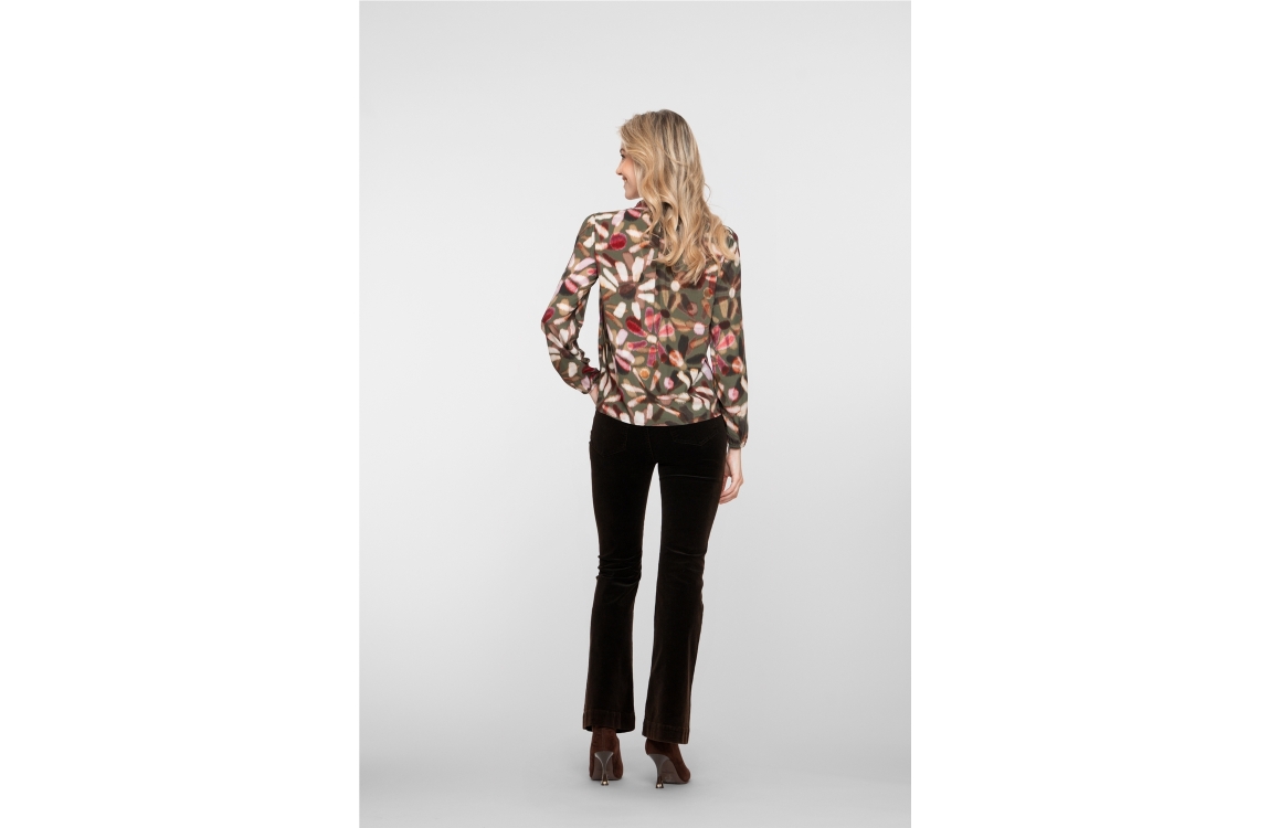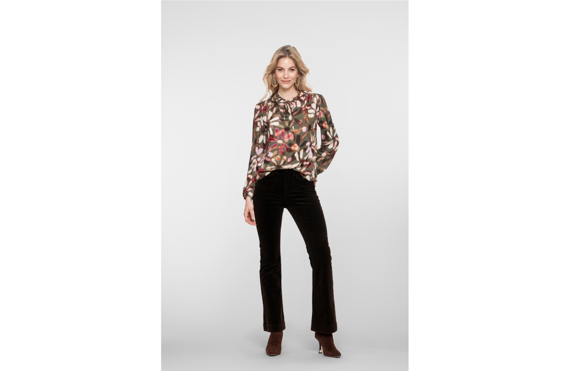 Geisha broek 51549-10. Dit flared fit model sluit door middel van een knoop en rits afgewerkt met ceintuurlussen. Deze zwart/bruine broek van Geisha beschikt over twee klepzakken aan de voorzijde en twee steekzakken aan de achterzijde. Dit model is uitgevoerd in een corduroy kwaliteit.