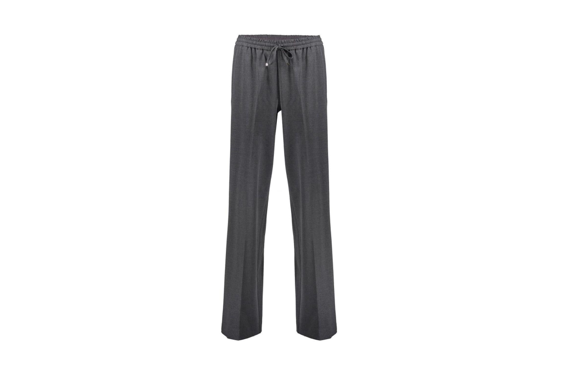 Geisha Pants flair + piping 930 Mid grey. Dit rechtvallende model sluit door middel van een elastieke tailleband met aantrekkoord. Deze grijze pantalon van Geisha heeft twee steekzakken en is een high-rise model. Het model op de foto is 178 cm lang en draagt maat S/36.