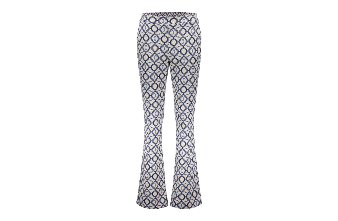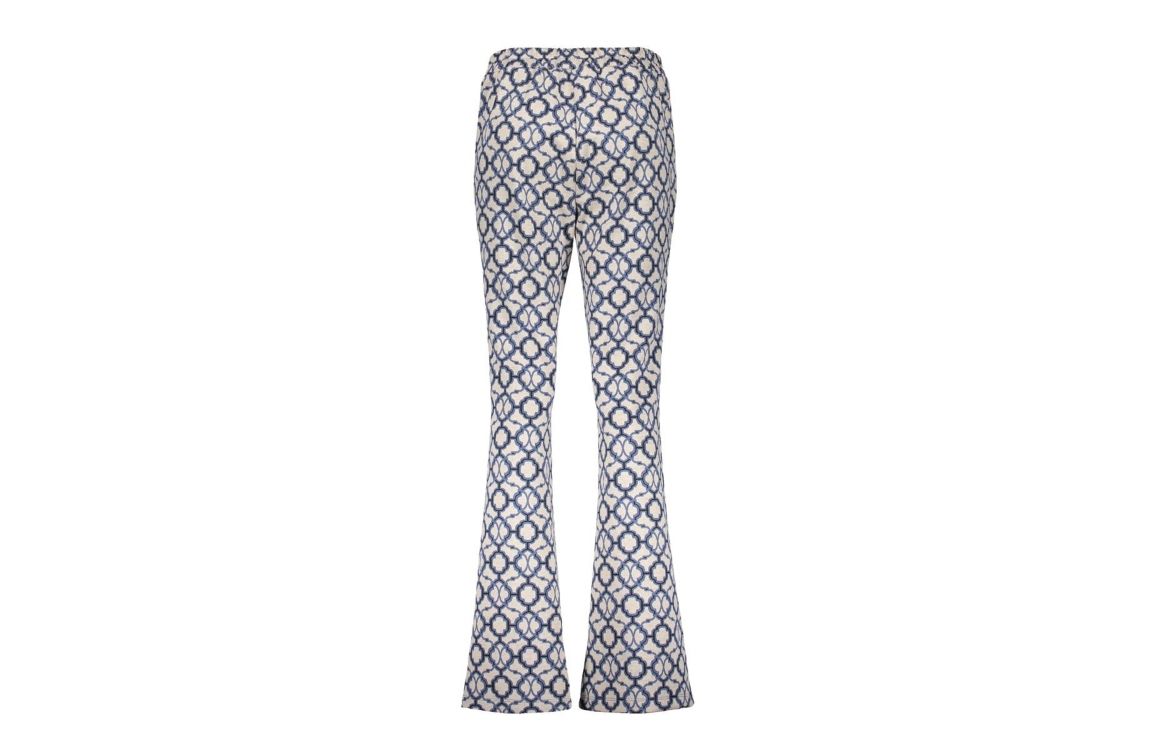 Geisha broek 51170-70. Dit flared fit model sluit door middel van een elastische band. Deze off white broek van Geisha beschikt over twee steekzakken en is voorzien van een blauwe mosaic print.