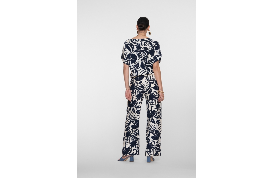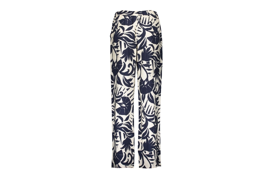 Geisha Pants naive flower 675 Navy. Dit rechtvallende model sluit door middel van een knoop en rits sluiting en heeft uitlopende pijpen. Deze creme kleurige broek van Geisha is all-over bewerkt met een donkerblauwe grafische bloemprint.