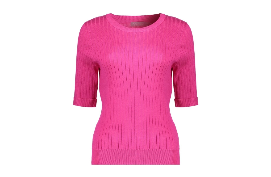 Geisha Pull basic s/sl 445 Fuchsia. Dit aangesloten model is voorzien van een ronde hals en heeft korte mouwen. Deze roze top van Geisha is bewerkt met een ribstructuur en afgewerkt met ribgebreide boorden.