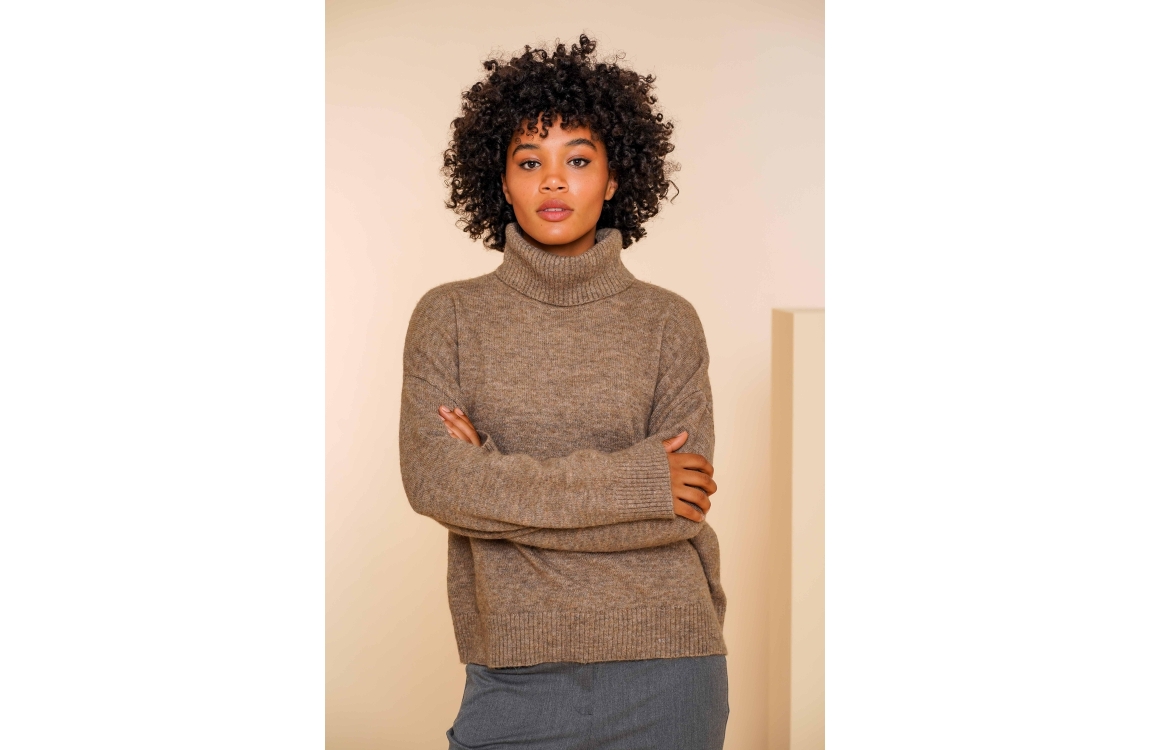 Geisha coltrui 44513-10 000745. Dit rechtvallend model heeft een hoge omgeslagen col en lange mouwen. Deze bruine coltrui van Geisha is uitgevoerd in een breisel met brede ribstof boorden.