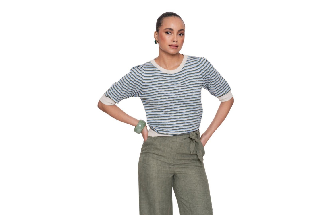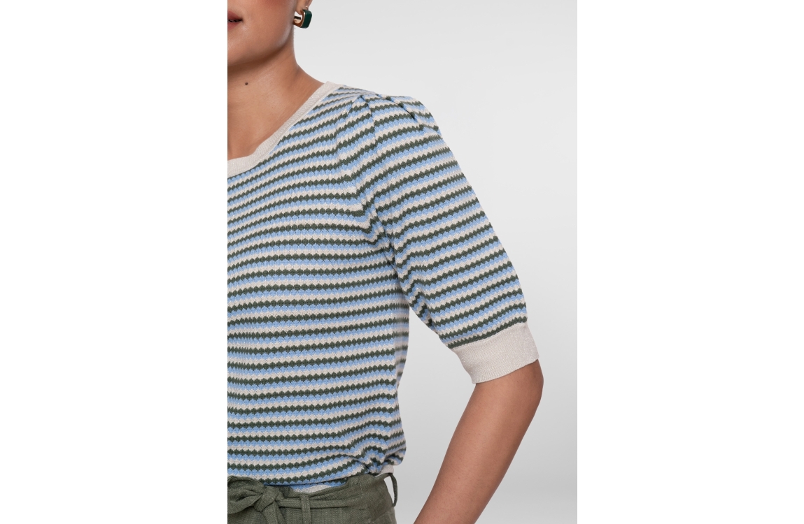 Geisha pullover 64066-14. Dit rechtvallend model is voorzien van een ronde hals en heeft korte mouwen. Deze groen/blauw/beige pullover van Geisha is bewerkt met strepen afgewerkt met glitter all-over.