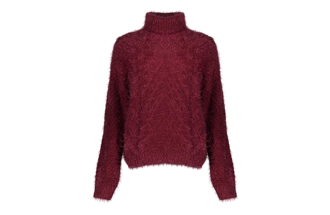 Geisha pullover 54515-40. Dit rechtvallende model heeft een turtleneck en lange mouwen. Deze burgundy pullover van Geisha is all-over bewerkt met kabelstructuur.