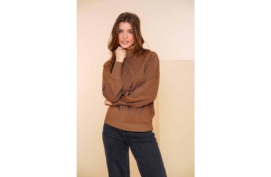 Geisha Online top 44567-14. Dit rechtvallend model heeft een turtleneck en lange pofmouwen. Deze bruine top van Geisha is all-over bewerkt met glitterdetails en is uitgevoerd in stretch kwaliteit.