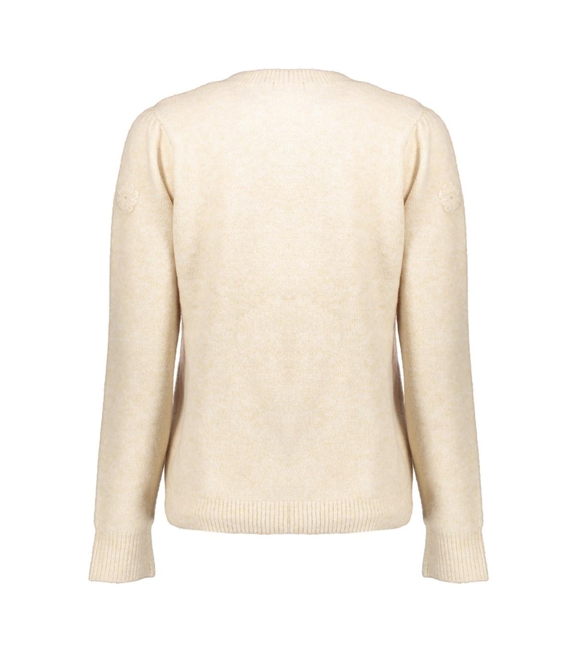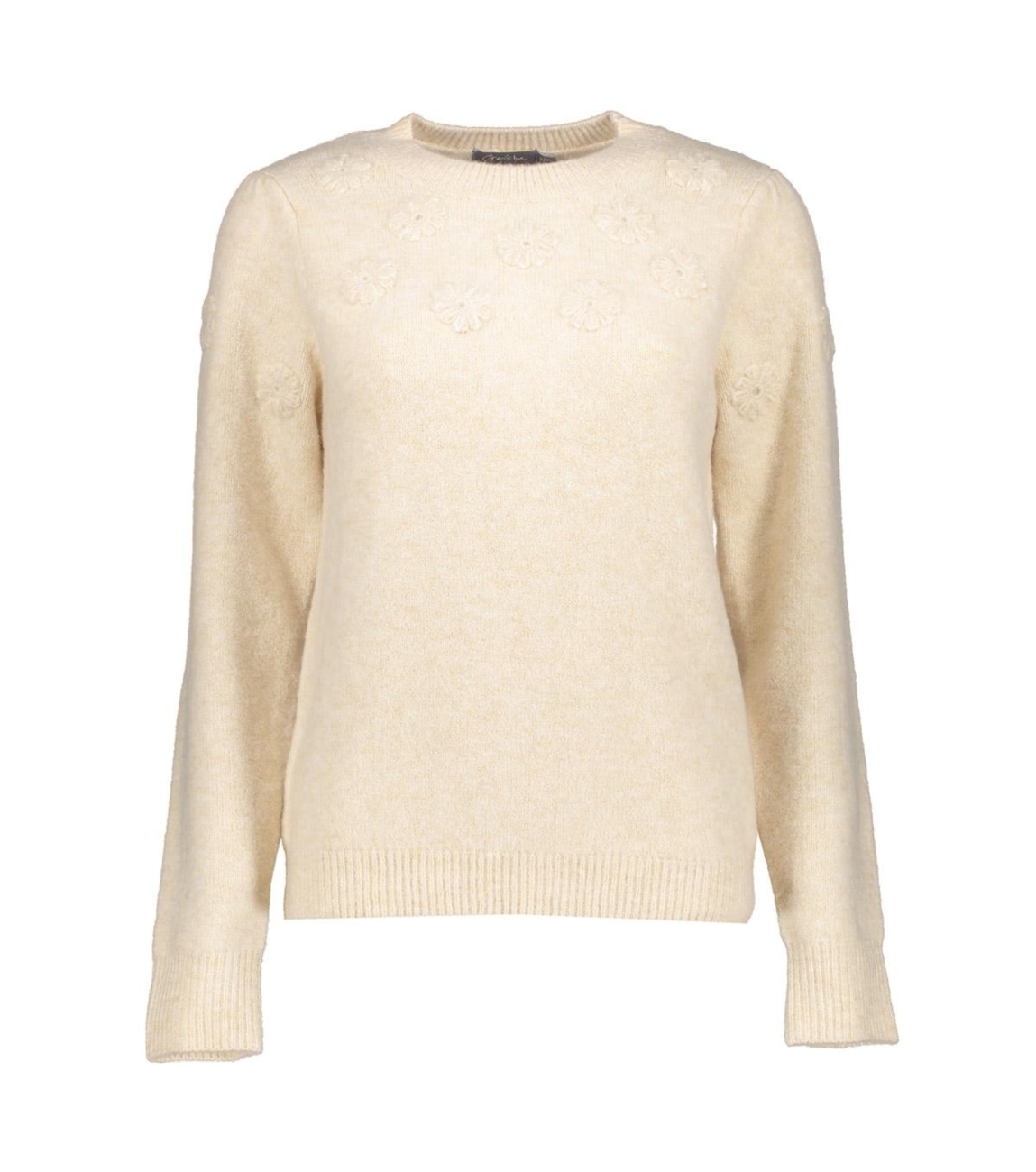 Geisha Pullover flowers 720 Sand. Dit rechtvallende model is voorzien van een ronde hals en heeft lange mouwen. Deze beige pullover van Geisha is bewerkt met geborduurde bloemen. Het model is 175cm lang en draagt maat S/36.