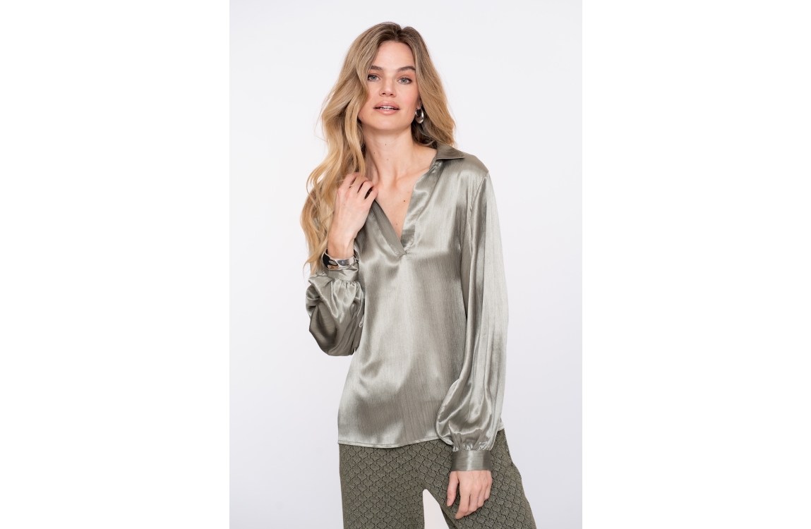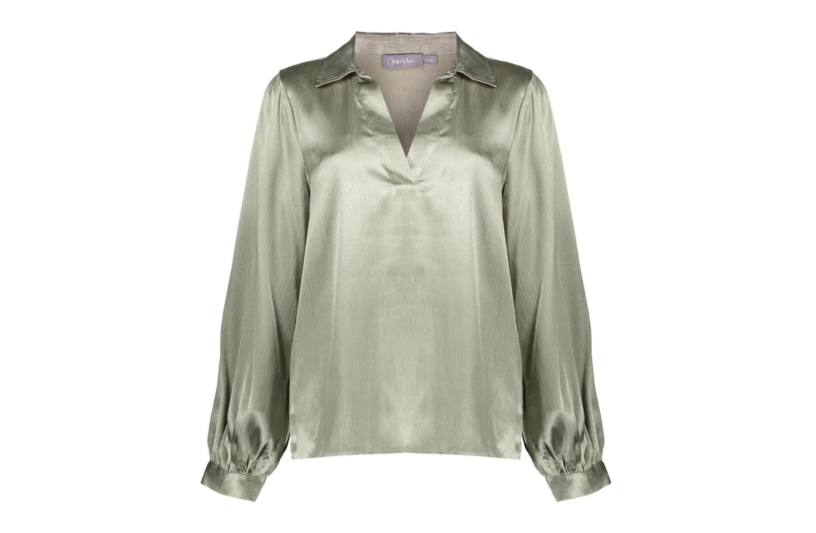 Geisha blouse 53530-14. Dit rechtvallend model is voorzien van een kraag met v-inkeping en heeft lange mouwen. Deze groene blouse van Geisha is uitgevoerd in een satijnachtig kwaliteit.