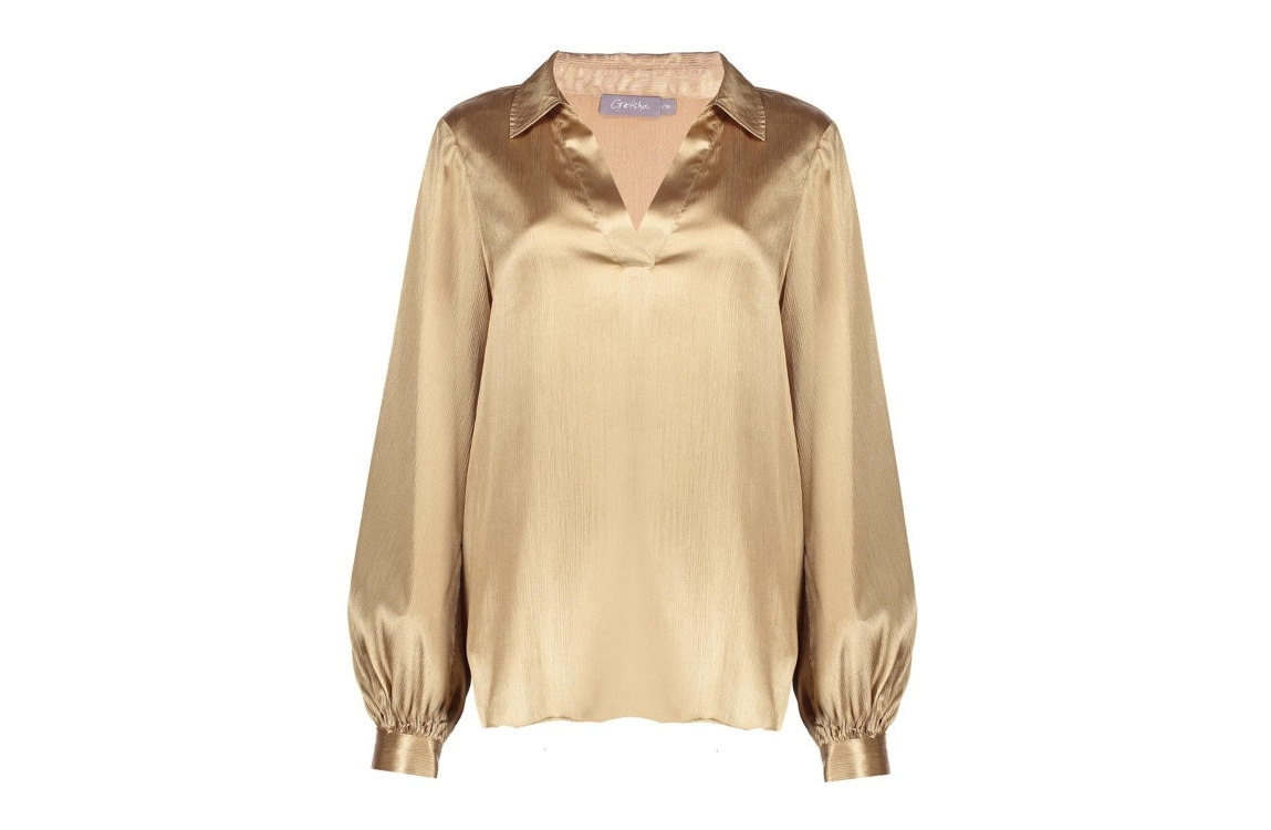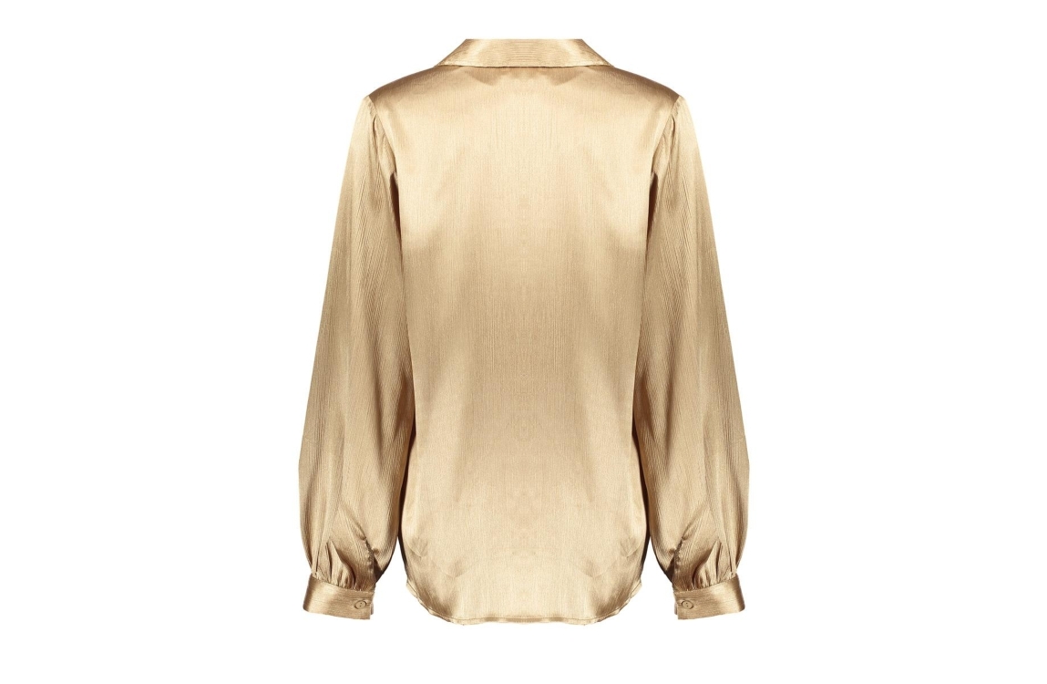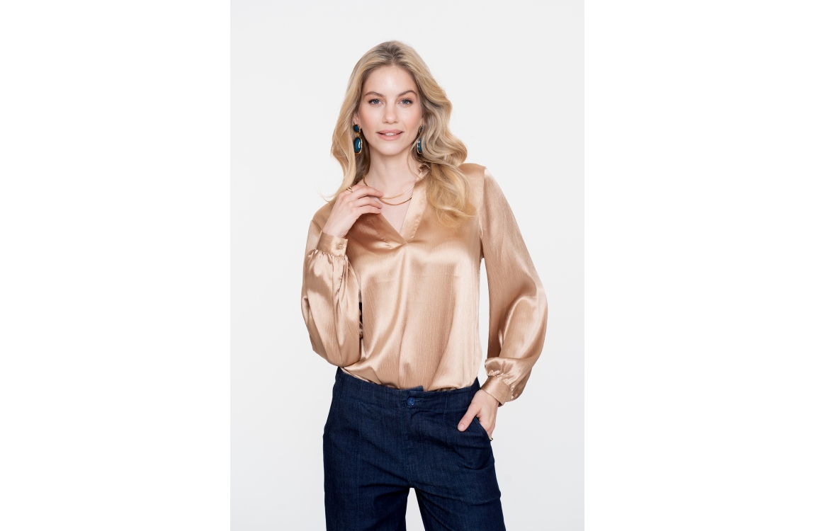 Geisha blouse 53530-14. Dit rechtvallend model is voorzien van een kraag met v-inkeping en heeft lange mouwen. Deze gouden Geisha blouse is uitgevoerd in een satijnachtig kwaliteit.