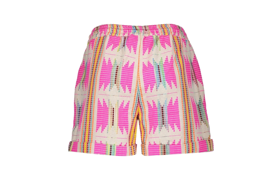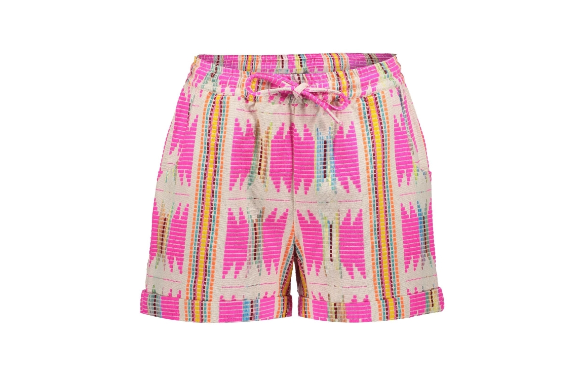 Geisha short 41153-21. Dit wijdvallende model is voorzien van een elastische tailleband en heeft korte pijpen voorzien van omslag. Dit kleurrijke model van Geisha is bewerkt met een all-over aztec print en voorzien van twee steekzakken aan de voorzijde.