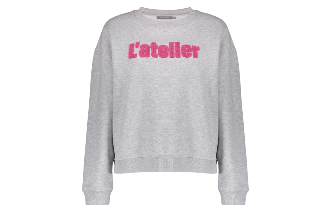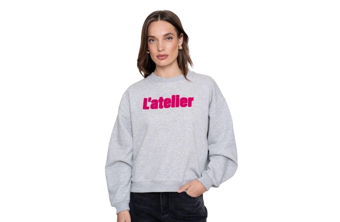 Geisha sweater 52601-41. Dit oversized model heeft een ronde halslijn en lange mouwen. Deze lichtgrijze sweater van Geisha is op het voorpand bewerkt met de tekst 'l'atelier' in een paarse kleur en heeft afgewerkte boorden.