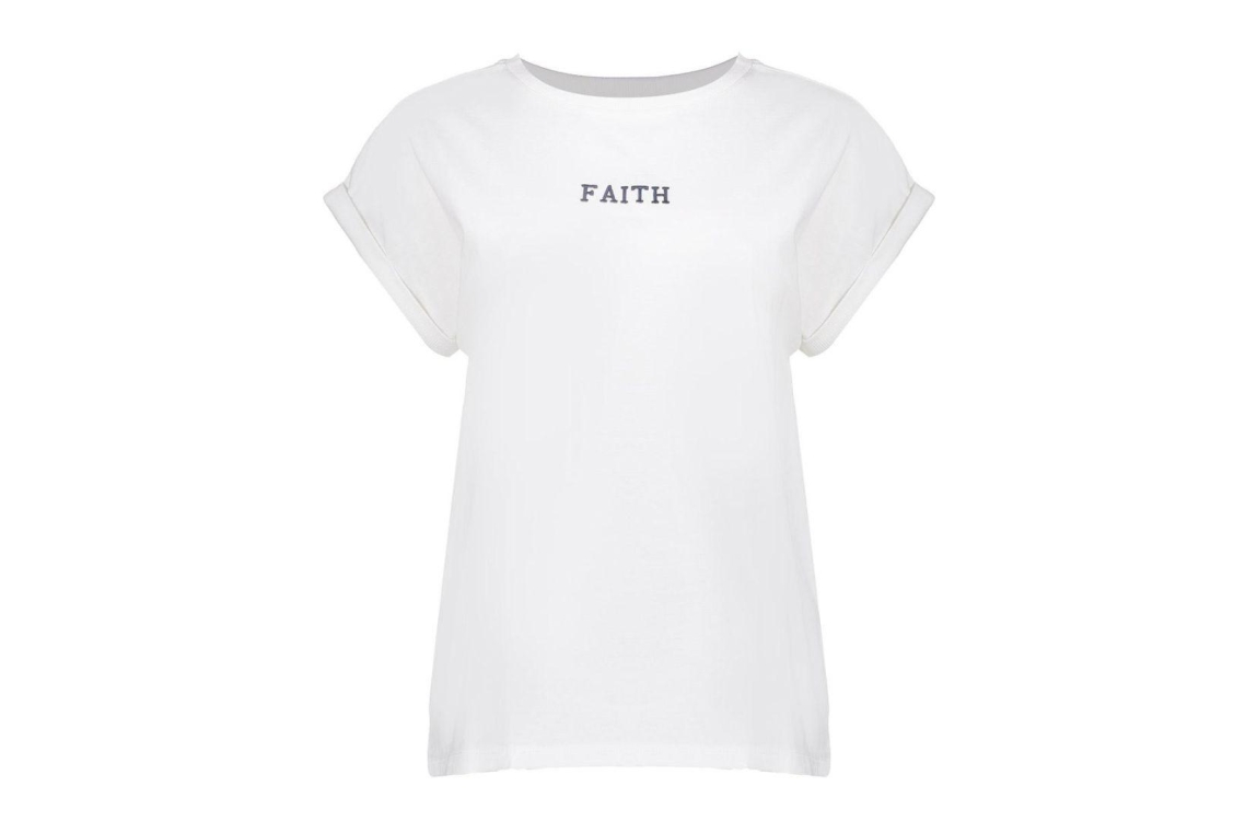 Geisha T-shirt 52607-41. Dit rechtvallend model is voorzien van een ronde hals en heeft korte mouwen. Deze witte T-shirt van Geisha is bewerkt met 'Faith' in de kleur zilver aan de voorzijde.