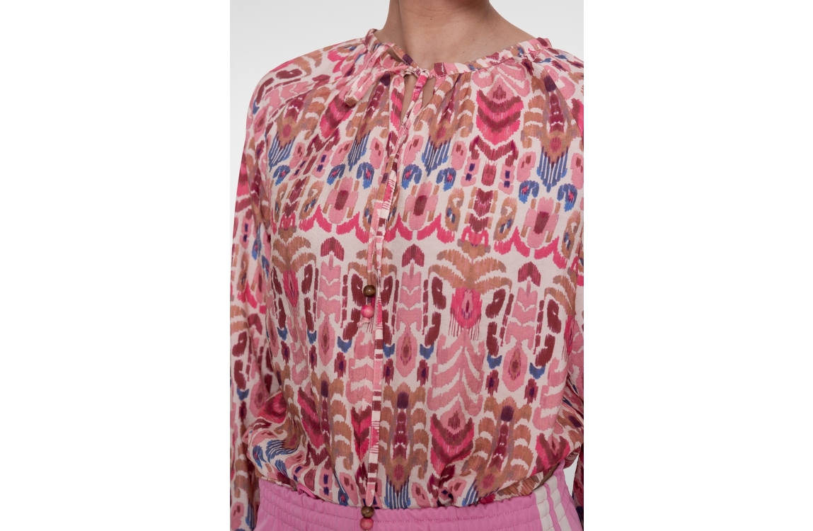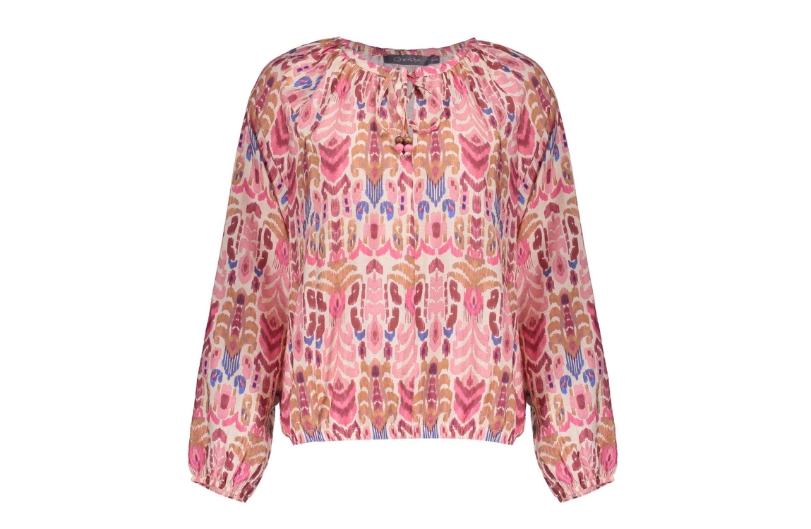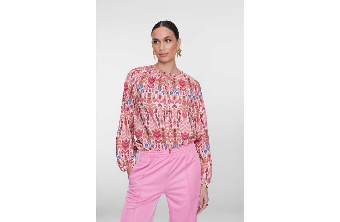 Geisha top 420 Pink. Dit rechtvallende model is voorzien van een ronde hals met v-inkeping dat sluit door middel van een kralen strikkoord en heeft lange mouwen. Deze roze blouse van Geisha is bewerkt met een print en afgewerkt met elastiek boorden.