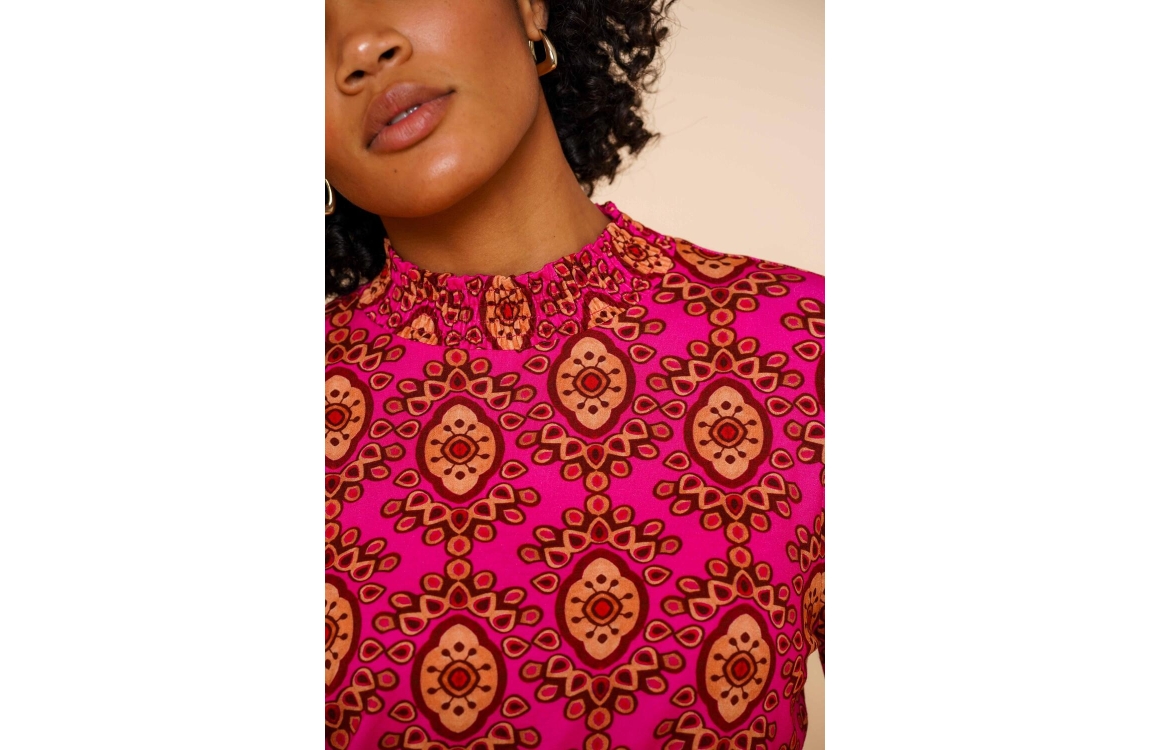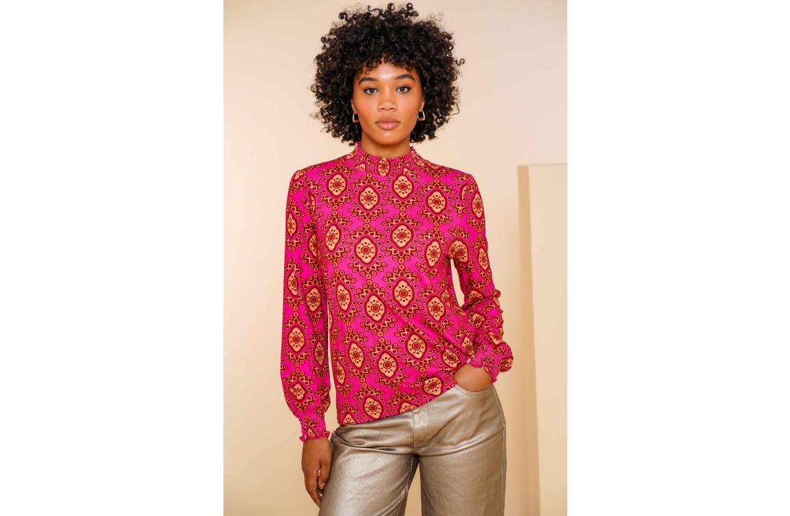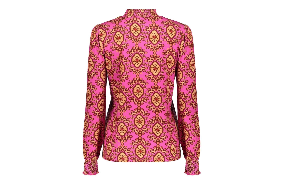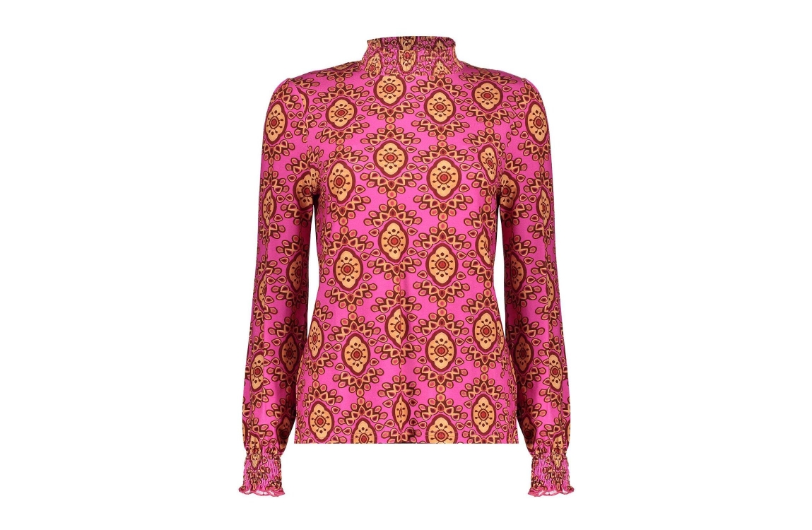 Geisha Online top 42666-20. Dit licht getailleerde model heeft een turtleneck met ruffles en lange mouwen met plooidetails. Deze roze top van Geisha is all-over bewerkt met een grafische print in verschillende kleuren en is uitgevoerd in een stretch kwaliteit.