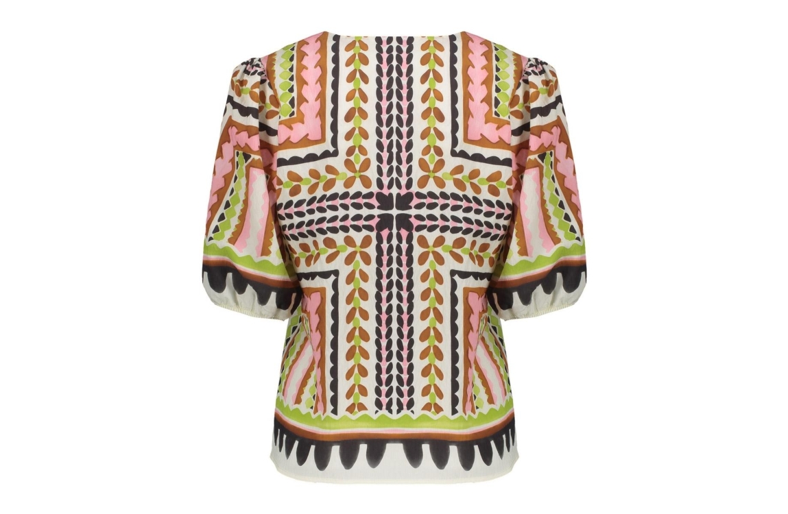 Geisha top 718 Ecru. Dit rechtvallende model is voorzien van een V-hals en heeft korte mouwen. Deze multicolour top van Geisha is all-over bewerkt met een kleurrijke print. Dit model is afgewerkt met elastische boorden bij de mouwen en heeft een subtiele plooi bij de schouders.