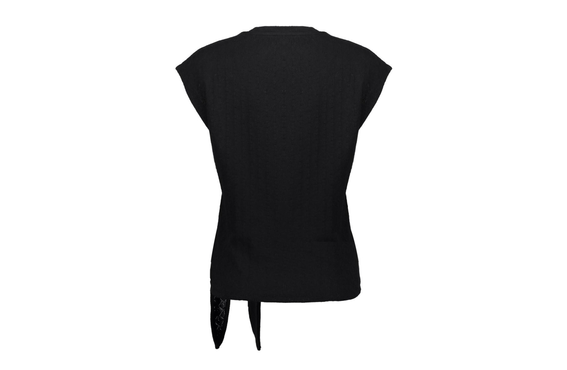 Geisha Top ajour with knot 999 Black. Dit aansluitende model is voorzien van een ronde hals en heeft korte mouwen. Deze zwrate top van Geisha is afgewerkt met een strikdetail aan de onderzijde.
