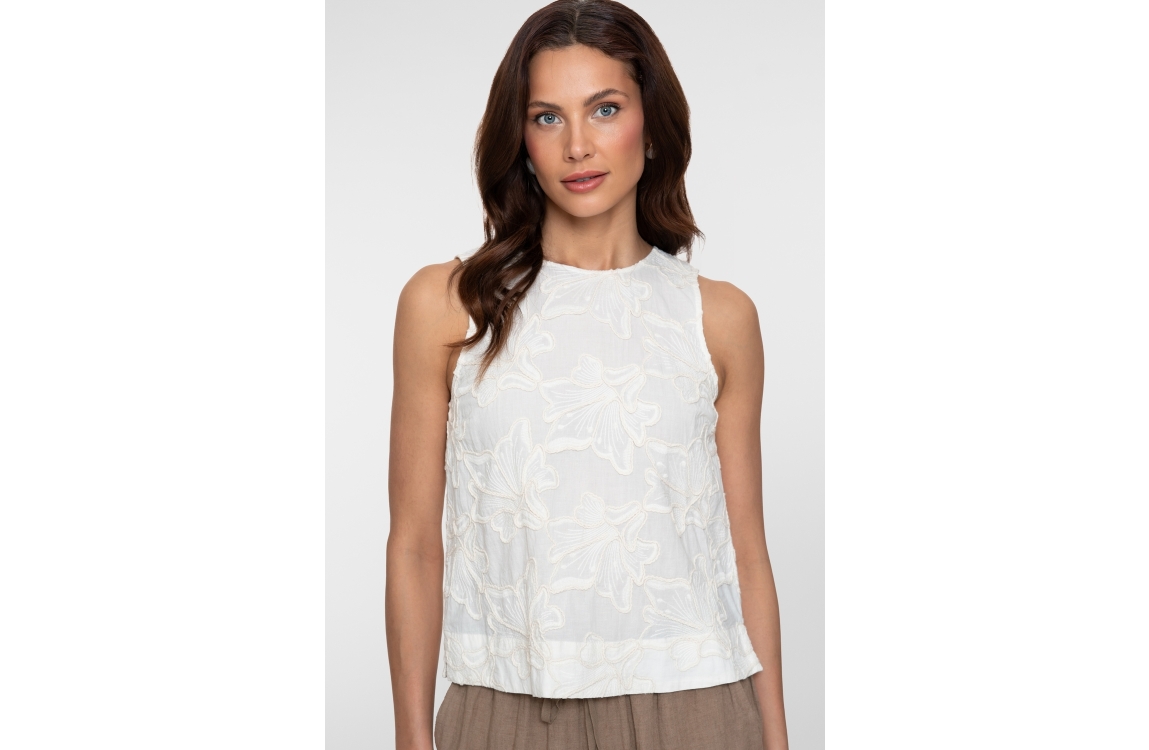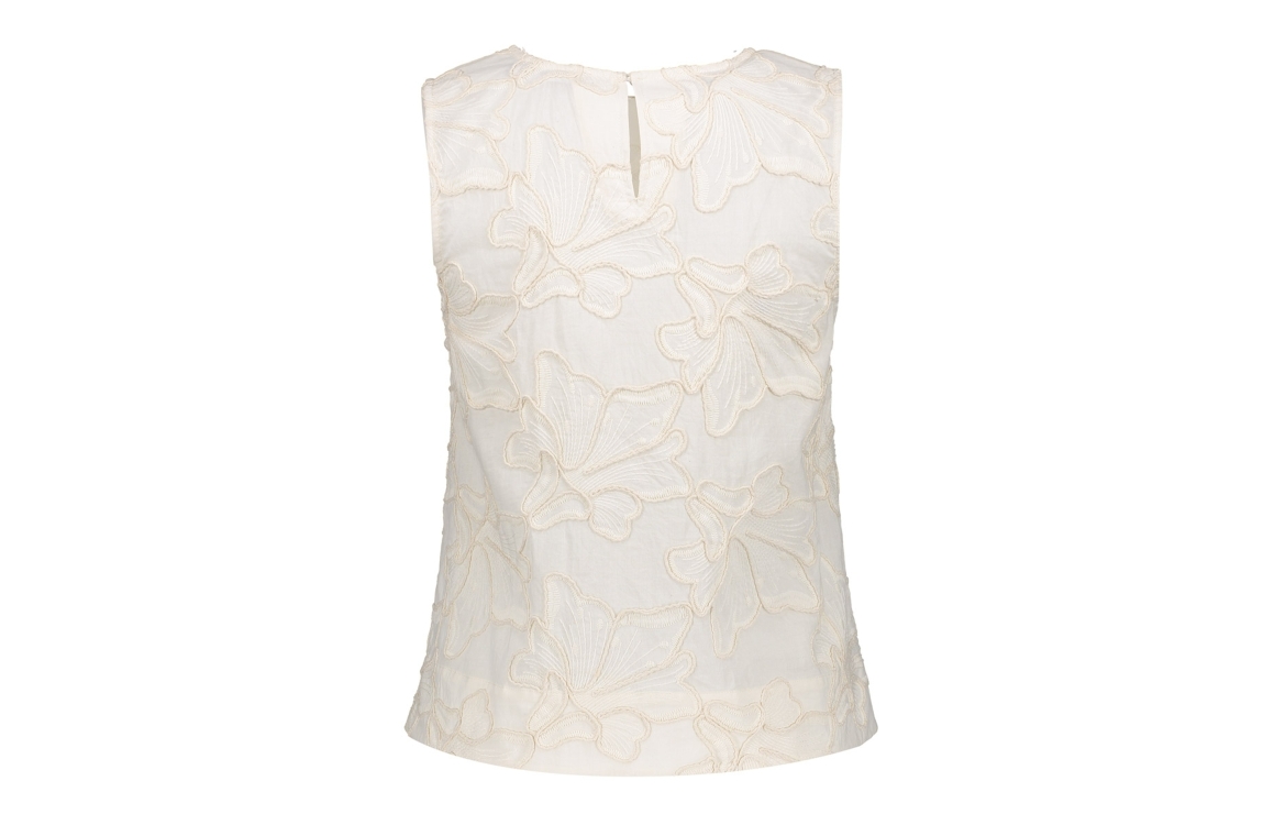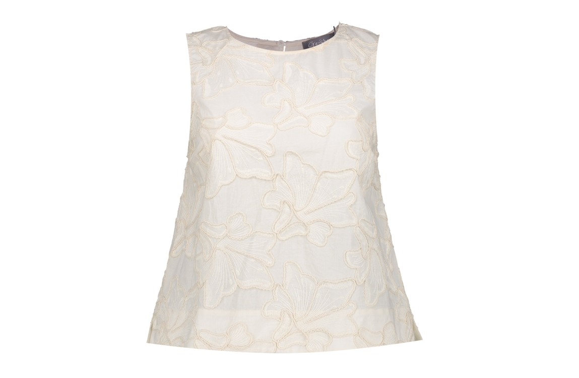 Geisha top 63301-10 710. Het rechtvallende model heeft een ronde halslijn en is mouwloos. Dit kitkleurige top van Geisha is all-over bewerkt met een structuur in een bloemmotief en heeft een knoopsluiting aan de achterzijde.