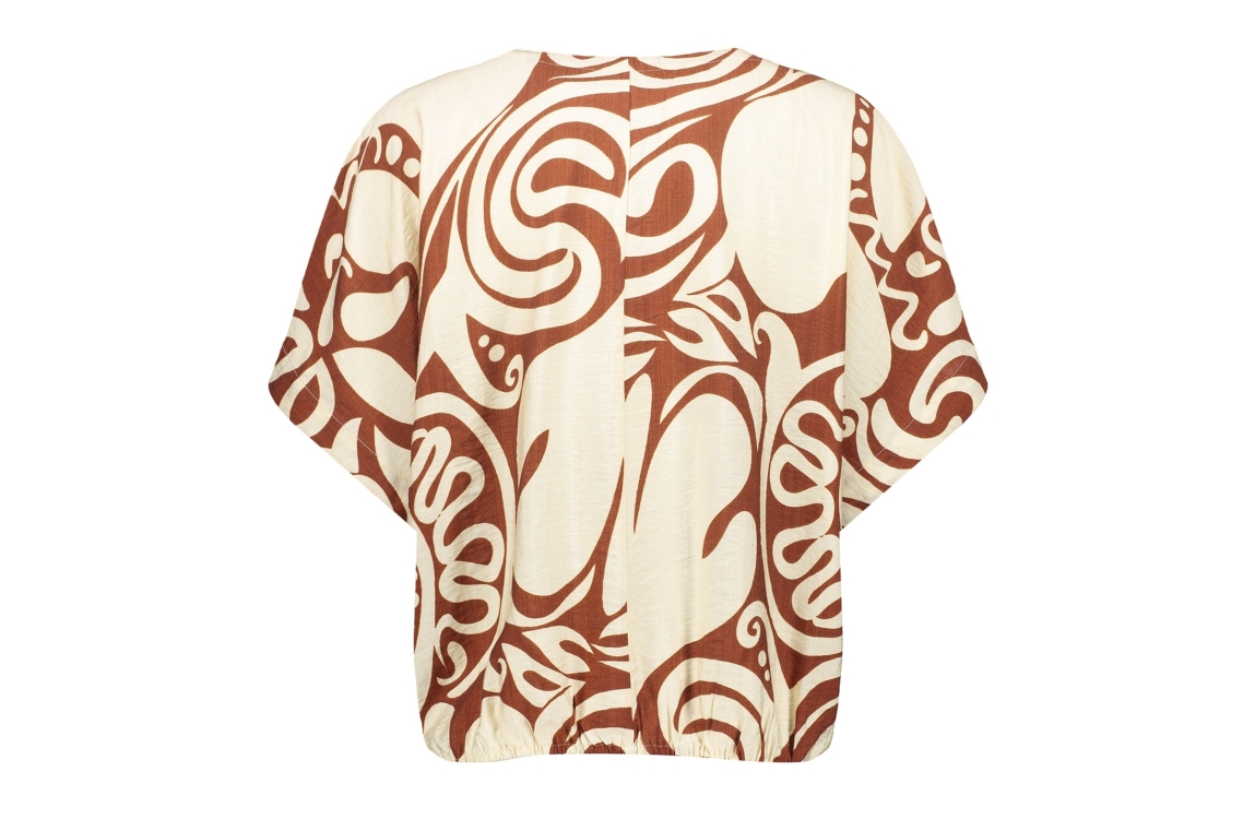 Geisha top 63435-26 760. Dit soepelvallende model heeft een V-hals en gedropte schoudernaden met korte mouwen. Deze ecrukleurige top van Geisha is all-over bewerkt met een grafische print en is afgewerkt met een elastische zoom.