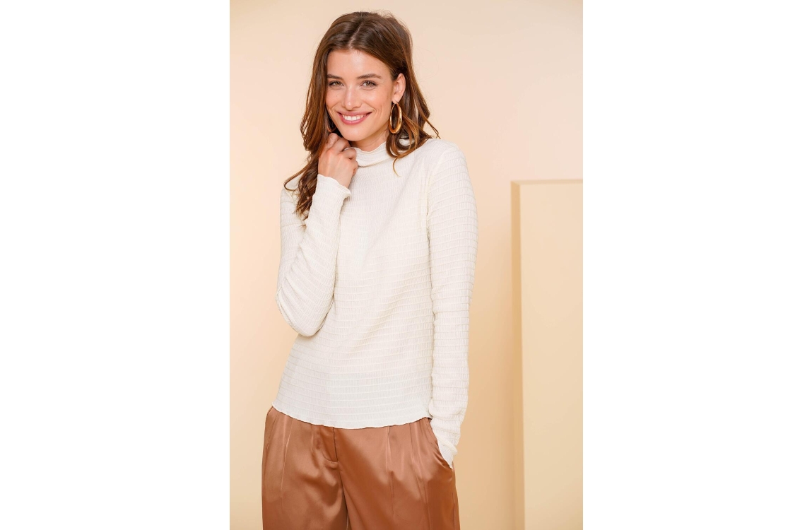 Geisha Online top 42605-41. Dit aangesloten model heeft een turtleneck met ruffles en lange mouwen. Deze off white top van Geisha is all-over bewerkt met een ruffle structuur en is uitgevoerd in een stretch kwaliteit.