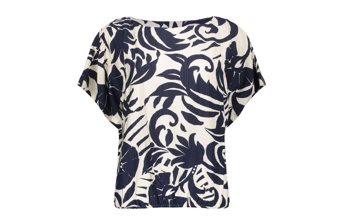 Geisha top 63236-26. Dit rechtvallend model is voorzien van een boothals en heeft korte mouwen. Deze navykleurige top van Geisha is all-over bewerkt met een bloemenprint en is afgewerkt met een elastische boord.