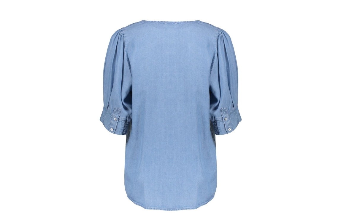 Geisha top NIKITA. Dit soepelvallend model is voorzien van een v-hals en heeft korte pofmouwen afgewerkt met knoopsluiting. Deze denim top van Geisha is uitgevoerd in een soepel materiaal.