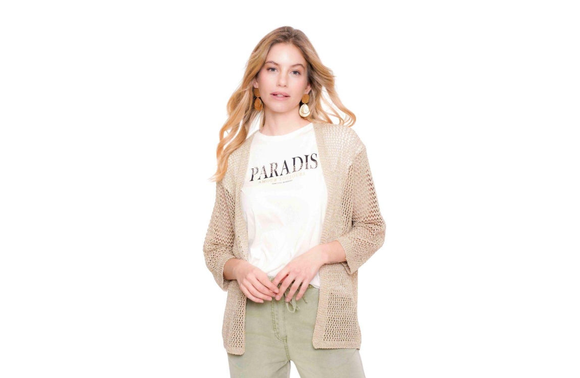 Geisha vest 54064-70. Dit rechtvallend model is voorzien van een ronde hals en heeft driekwart mouwen. Deze goud kleurige vest van Geisha is openvallend, gehaakt uitgevoerd en is bewerkt met een glitter.