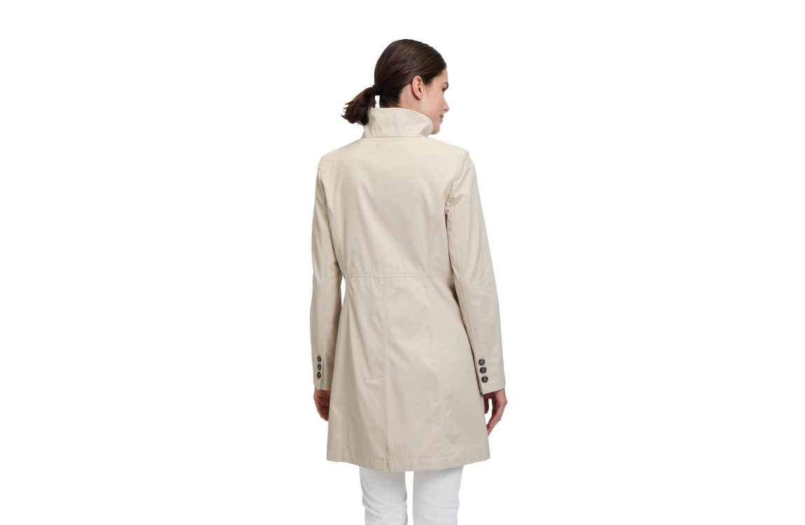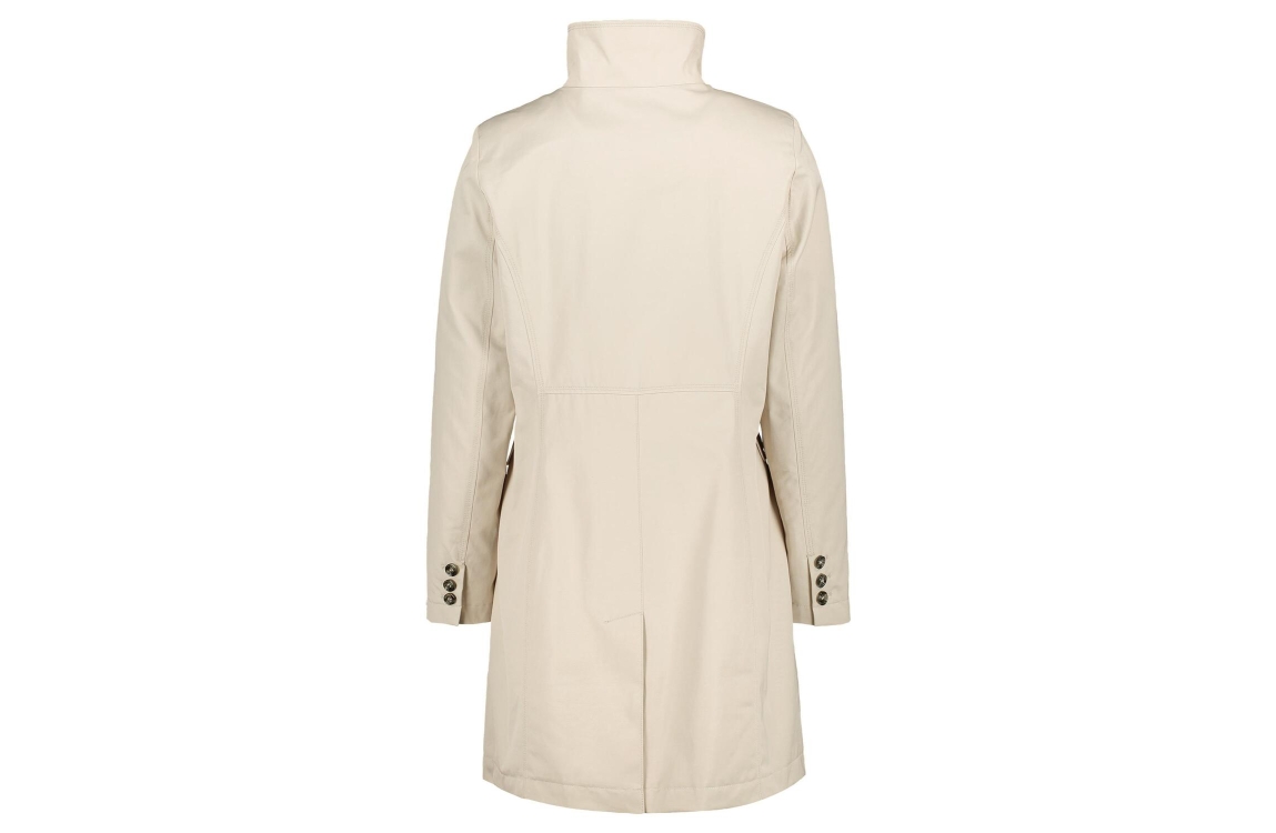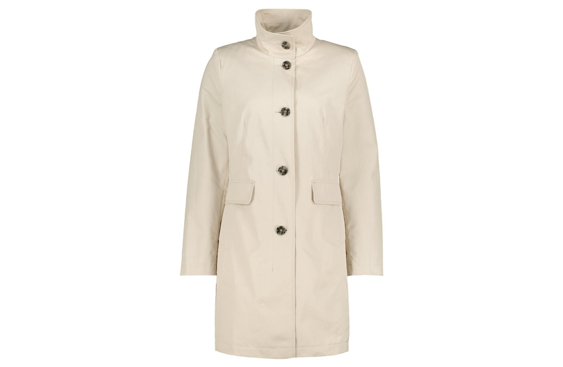 Gil Bret jas feminin. Dit rechtvallend model is voorzien van een opstaande kraag en heeft lange mouwen. Deze beige jas van Gilbret sluit door middel van knopen en beschikt over klepzakken.