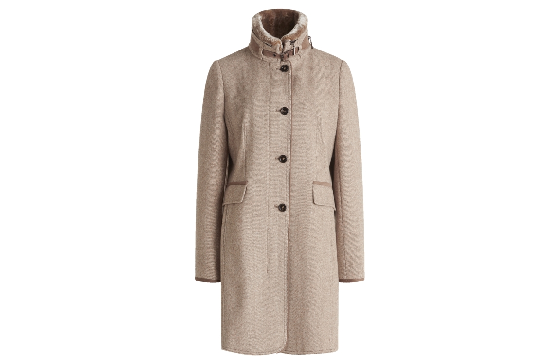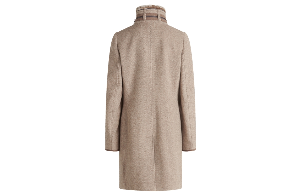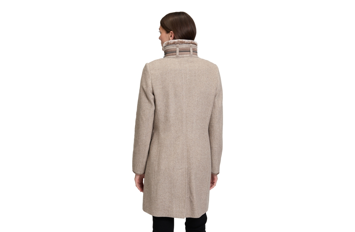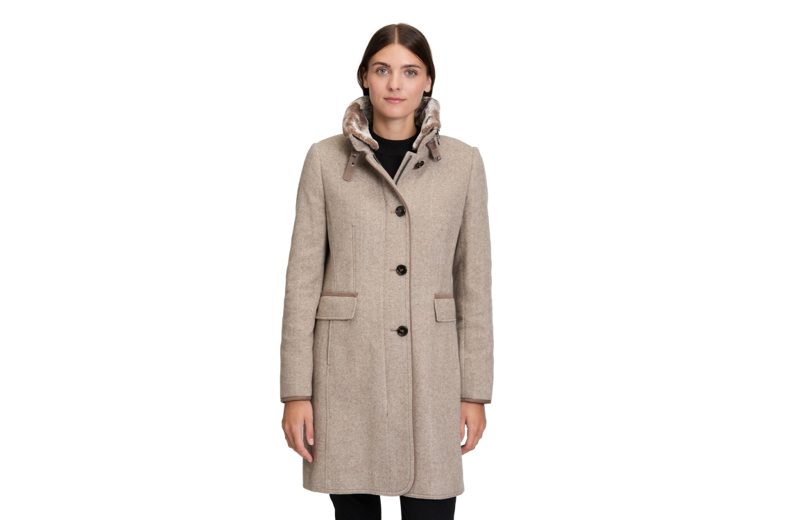 Gil Bret jas 95316152 9708. Dit regular fit model van Gil Bret heeft een opstaande kraag met imitatiebont en lange mouwen. De walnootkleurige jas sluit aan de voorzijde met een ritssluiting en knopen. Het model is all-over bewerkt met een fijne structuur en is voorzien van twee steekzakken.