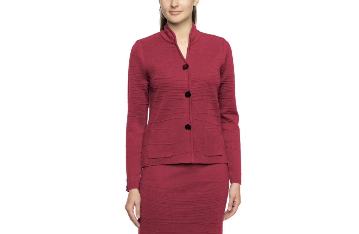 Golléhaug 02321-12132. Dit rechtvallende model heeft lange mouwen. Dit chilli rode jasje van Golléhaug is voorzien van een all-over patroon en sluit door middel van knopen aan de voorzijde. Dit model bevat twee zakken aan de voorzijde.