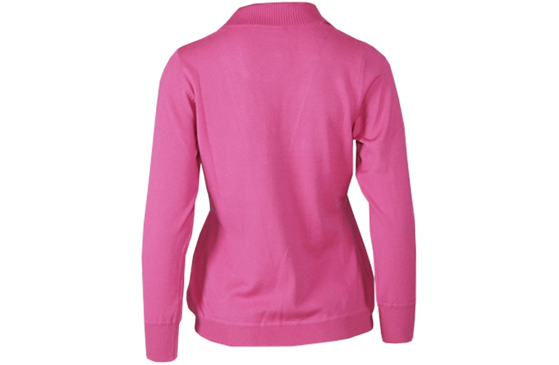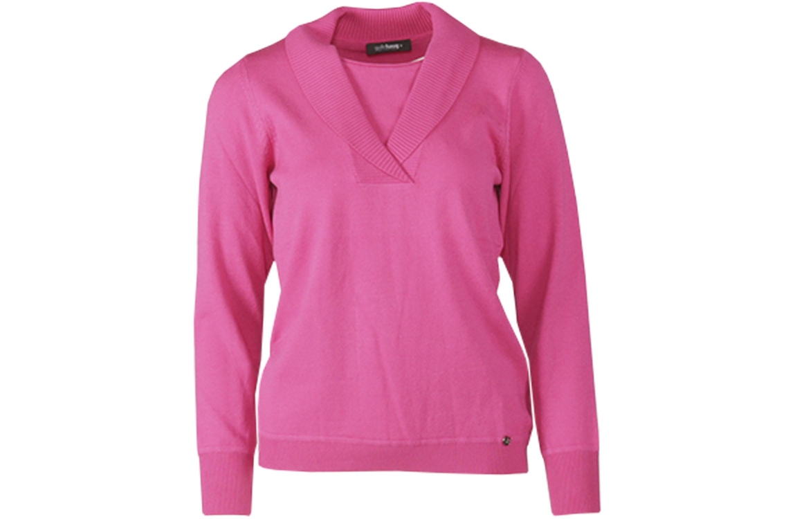 Golléhaug pullover 02324-11001. Deze pullover is voorzien van een v-hals met kraag en lange mouwen. Dit fuchsia model van Golléhaug is afgewerkt met een ribboord en het heeft een effen fake t-shirt eronder.