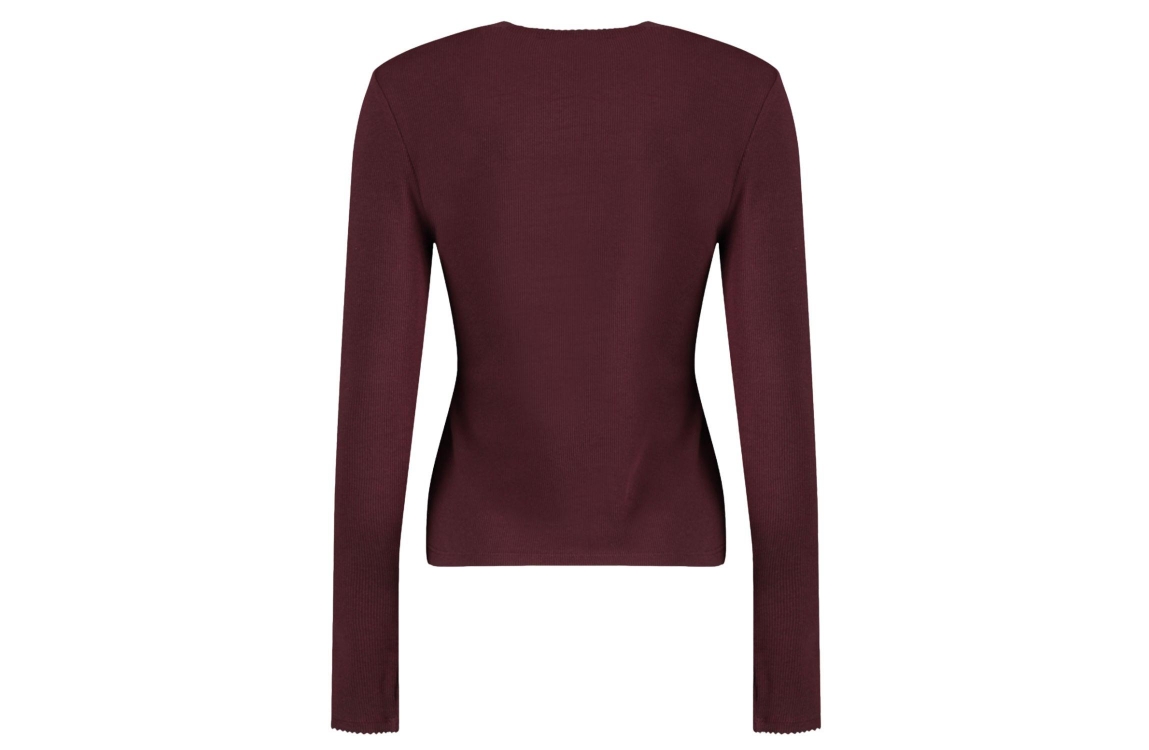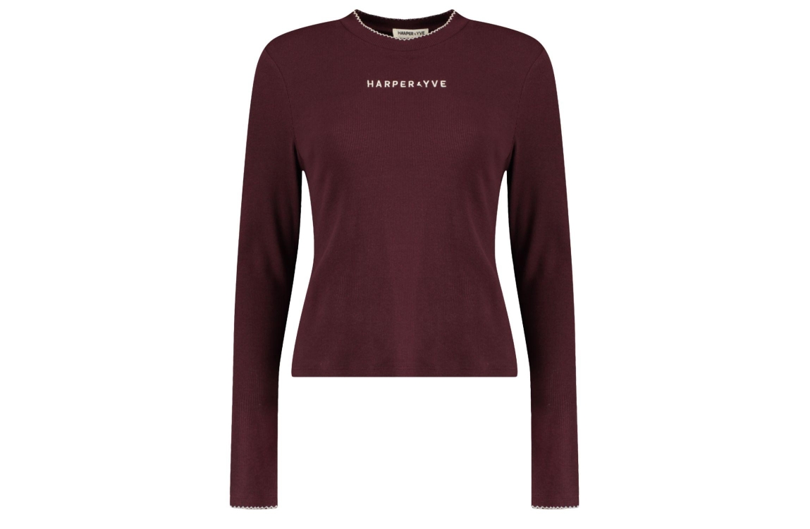 Harper and Yve top CAMMY-LS DW25P615. Dit aangesloten model heeft een hoge, ronde halslijn en lange mouwen. Deze wijnkleurige top van Harper & Yve is op het voorpand bewerkt met een merkembleem en is langs de boorden gedetailleerd met witte ruffles.