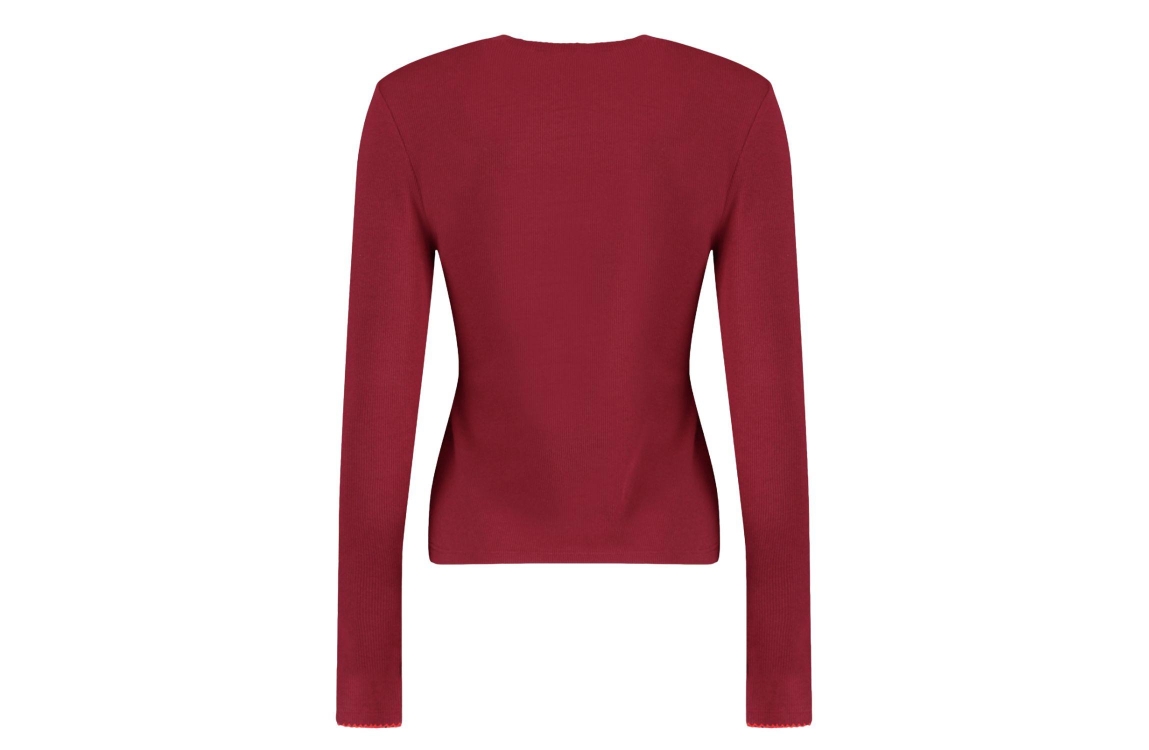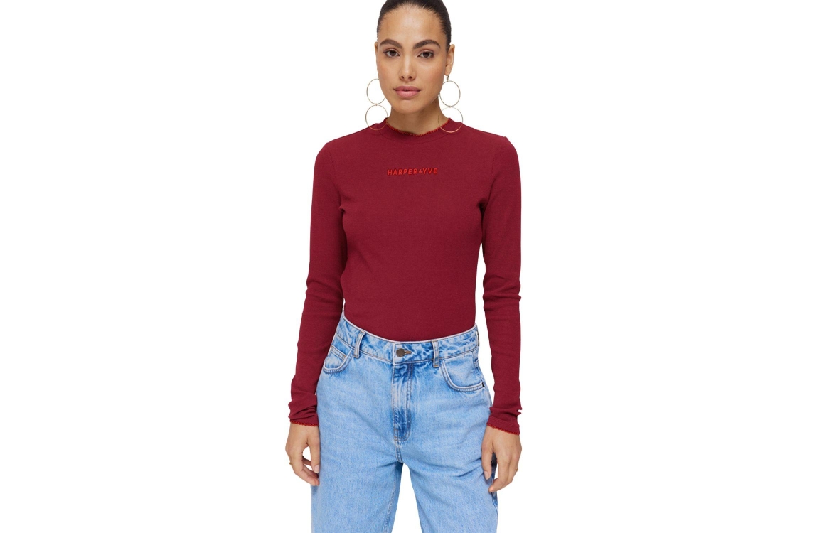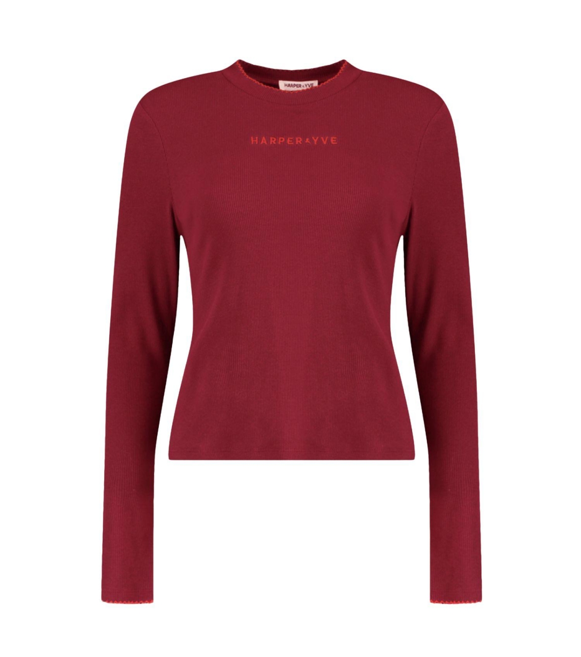 Harper and Yve top Cammy-LS DW25P615. Dit aangesloten model heeft een hoge ronde halslijn en lange mouwen. Deze rode top van Harper & Yve is op het voorpand bewerkt met een merkembleem en is langs de boorden gedetailleerd met lichtrode ruffles.