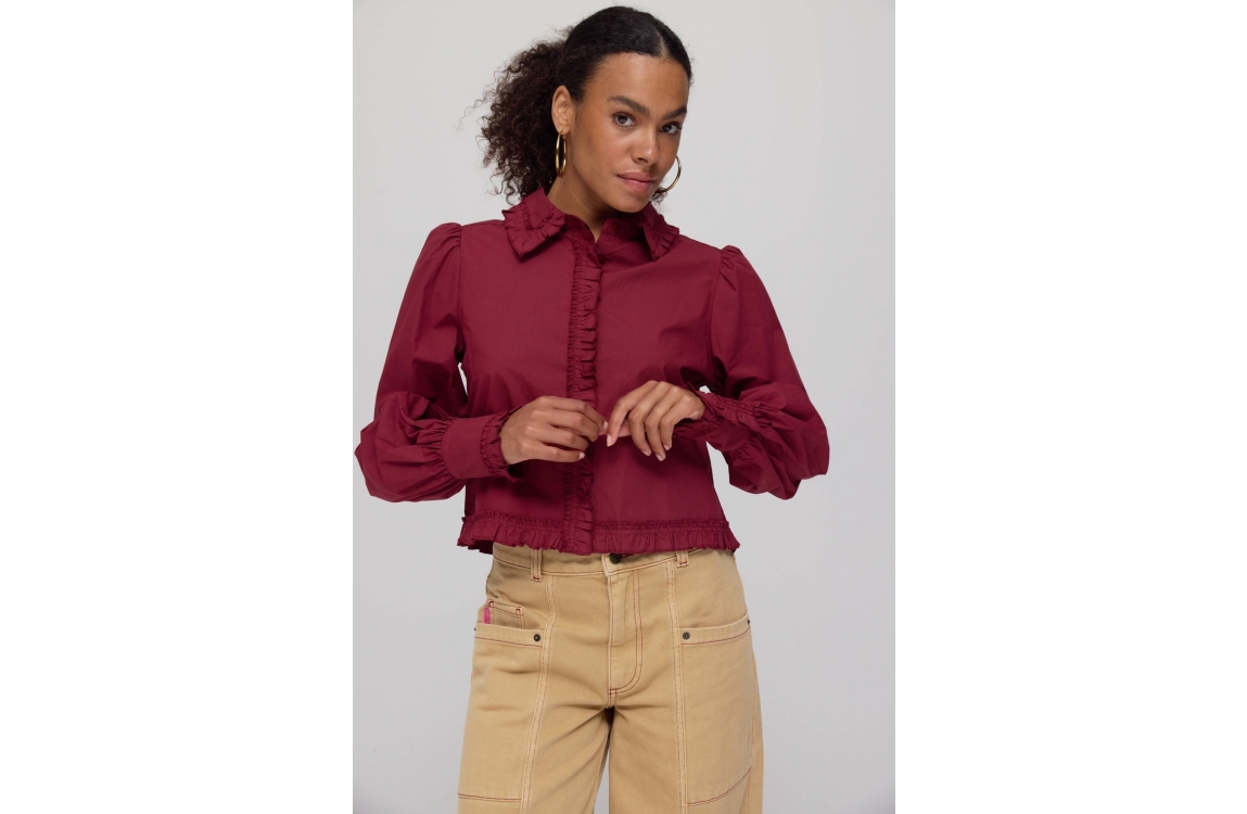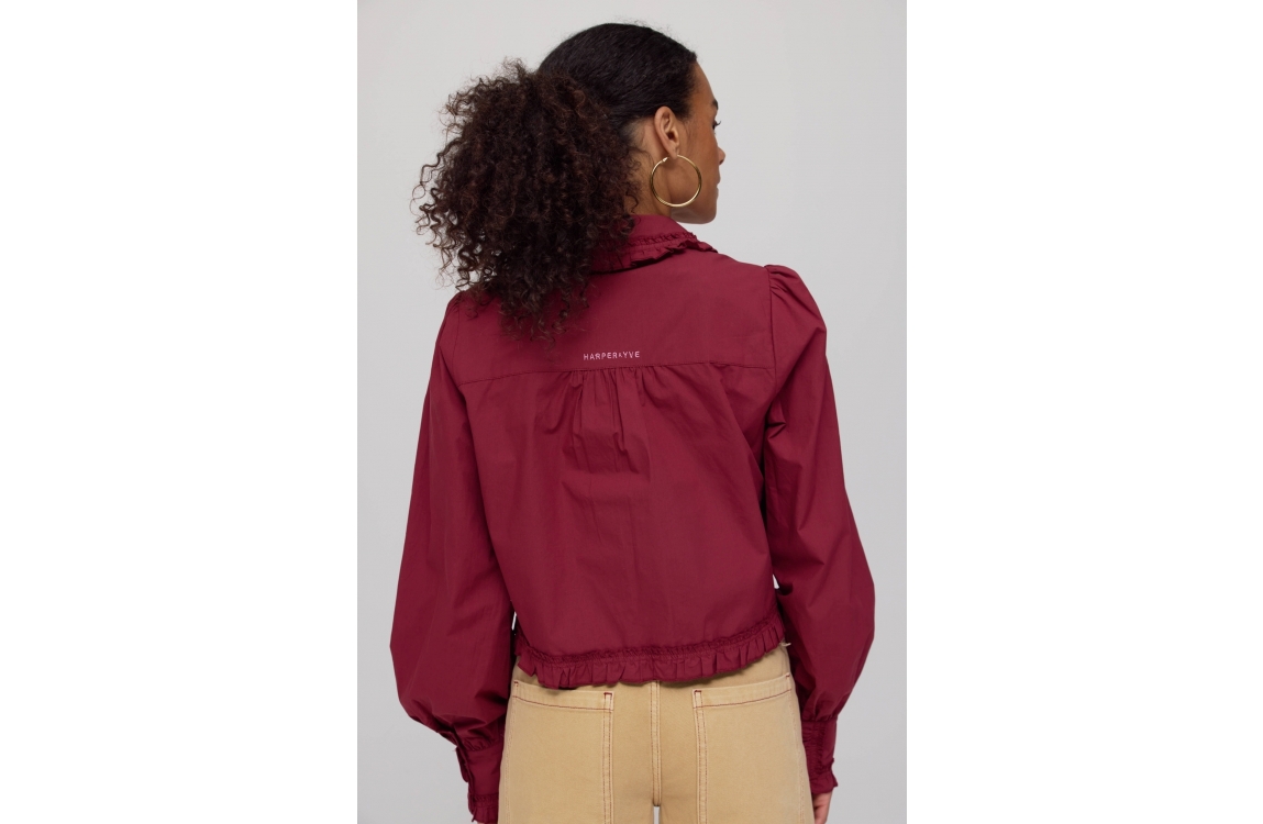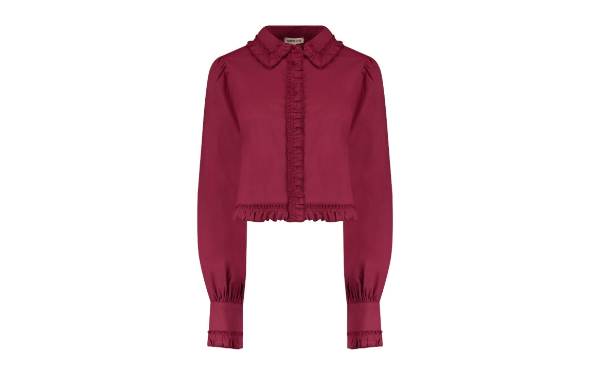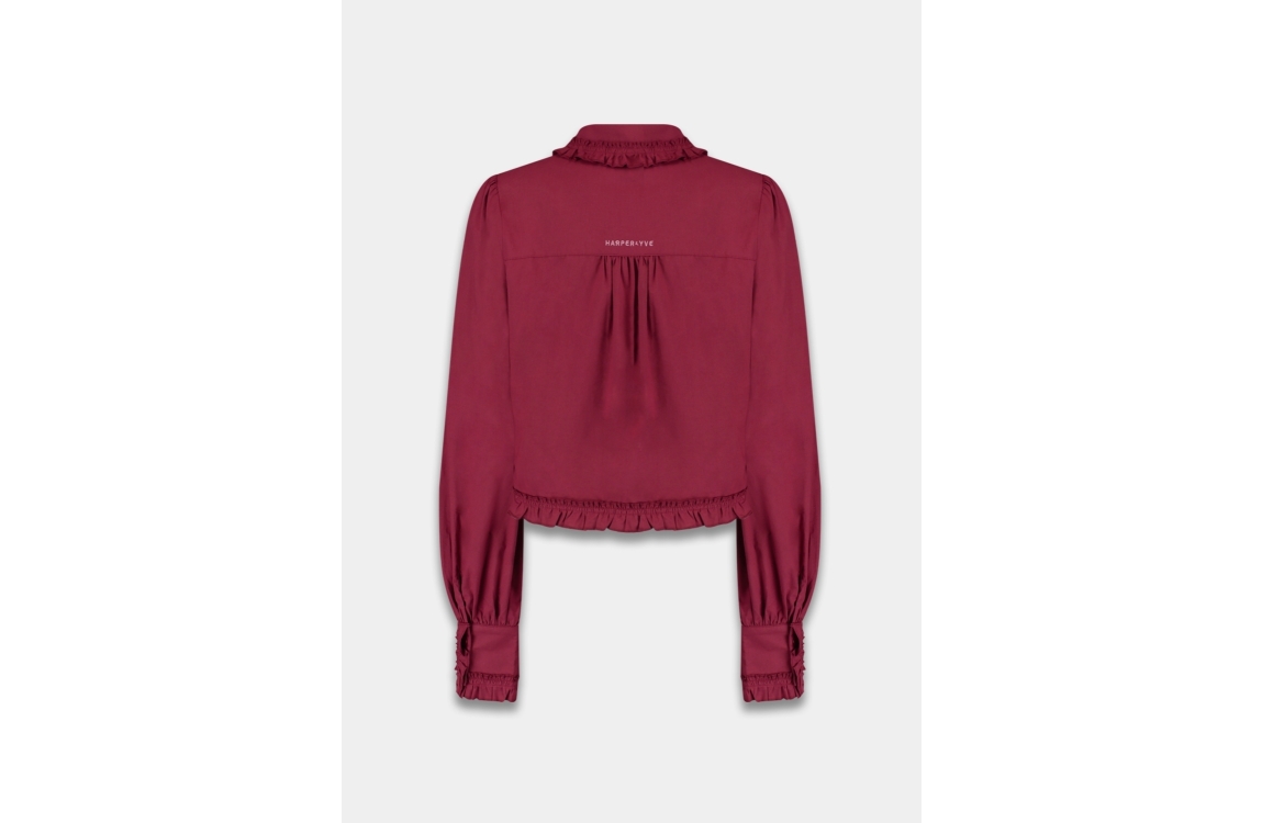 Harper and Yve ELLIE-LS 317 wine berry. Dit rechtvallende model heeft een omgeslagen kraag en lange mouwen. Deze bordeaux rode blouse van Harper and Yve sluit aan de voorzijde door middel van knopen en is afgewerkt met ruffles en plooidetails op de boorden en achterzijde.