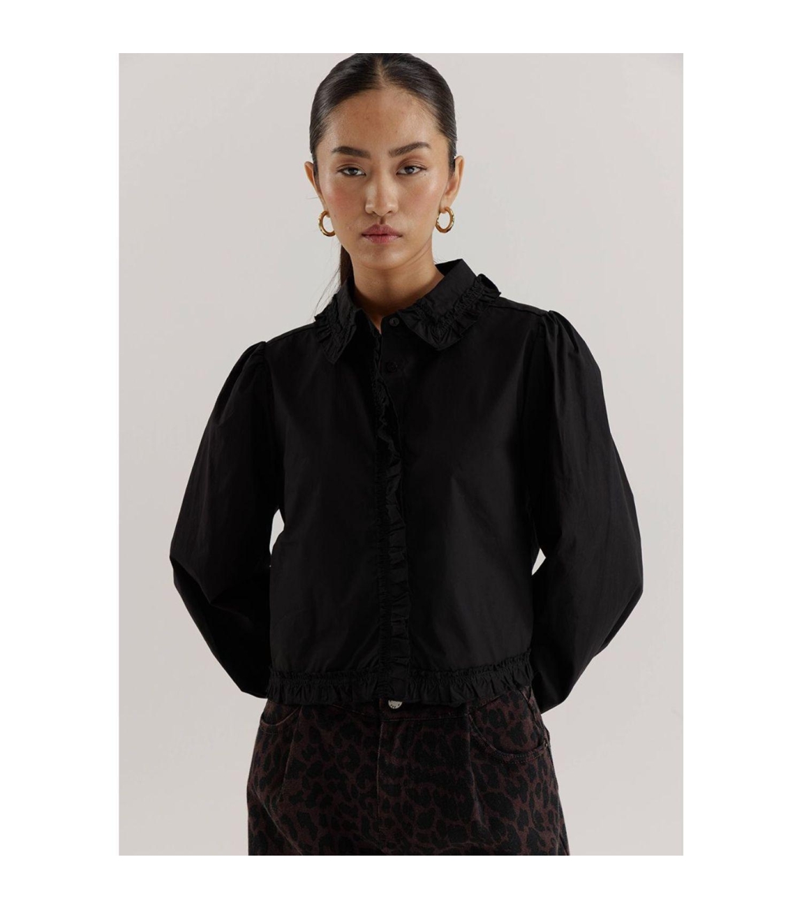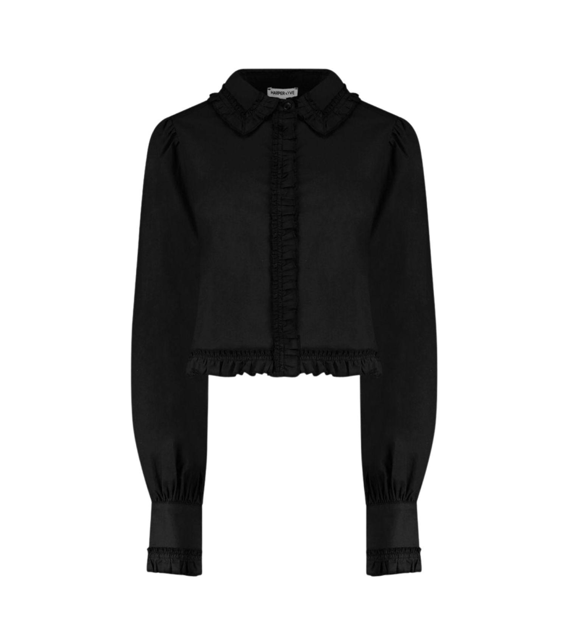 Harper and Yve ELLIE-LS Black. Dit rechtvallende model heeft een omgeslagen kraag en lange mouwen. Deze zwarte blouse van Harper and Yve sluit aan de voorzijde door middel van knopen en is afgewerkt met ruffles en plooidetails op de boorden en achterzijde.