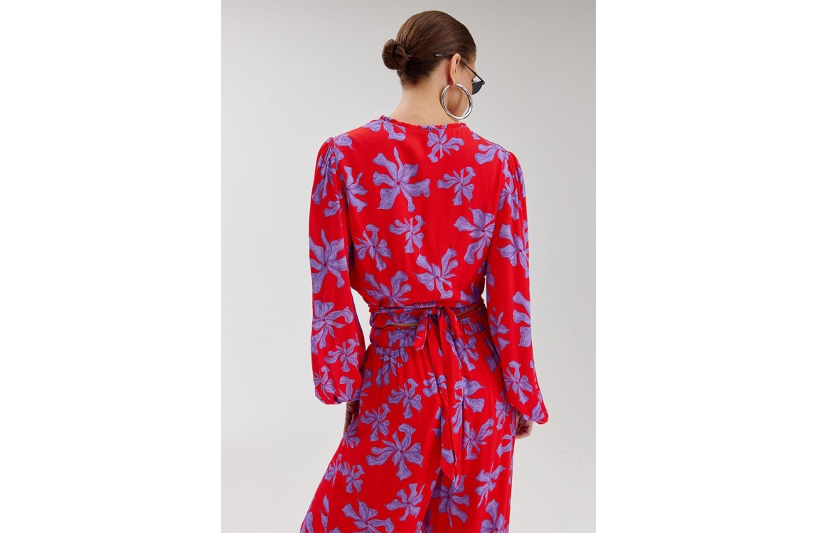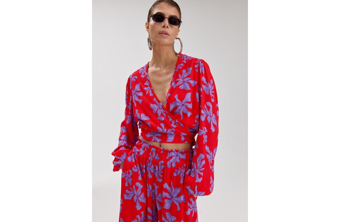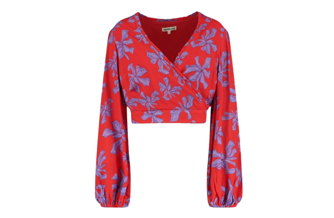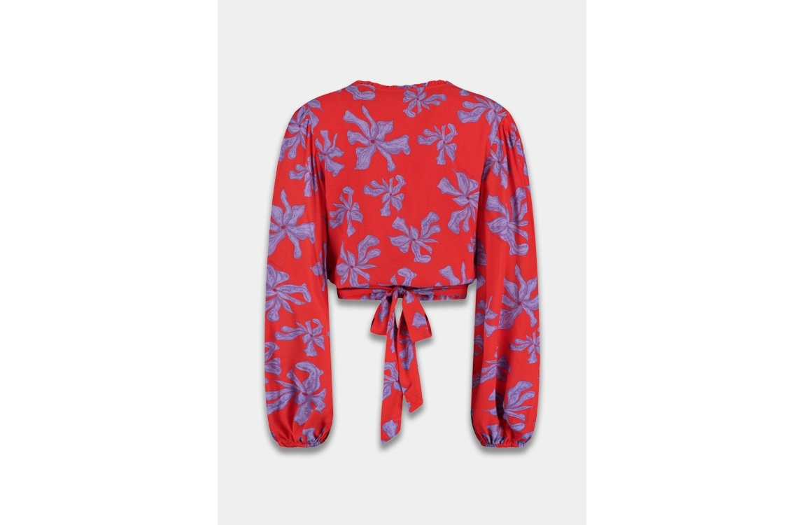 Harper and Yve FLORA-LS 628 wild rose. Dit aangesloten model is voorzien van een V-hals en heeft lange mouwen. Deze rode top van Harper and Yve is all-over bewerkt met een paarse print. Dit model sluit door middel van een strikdetail.