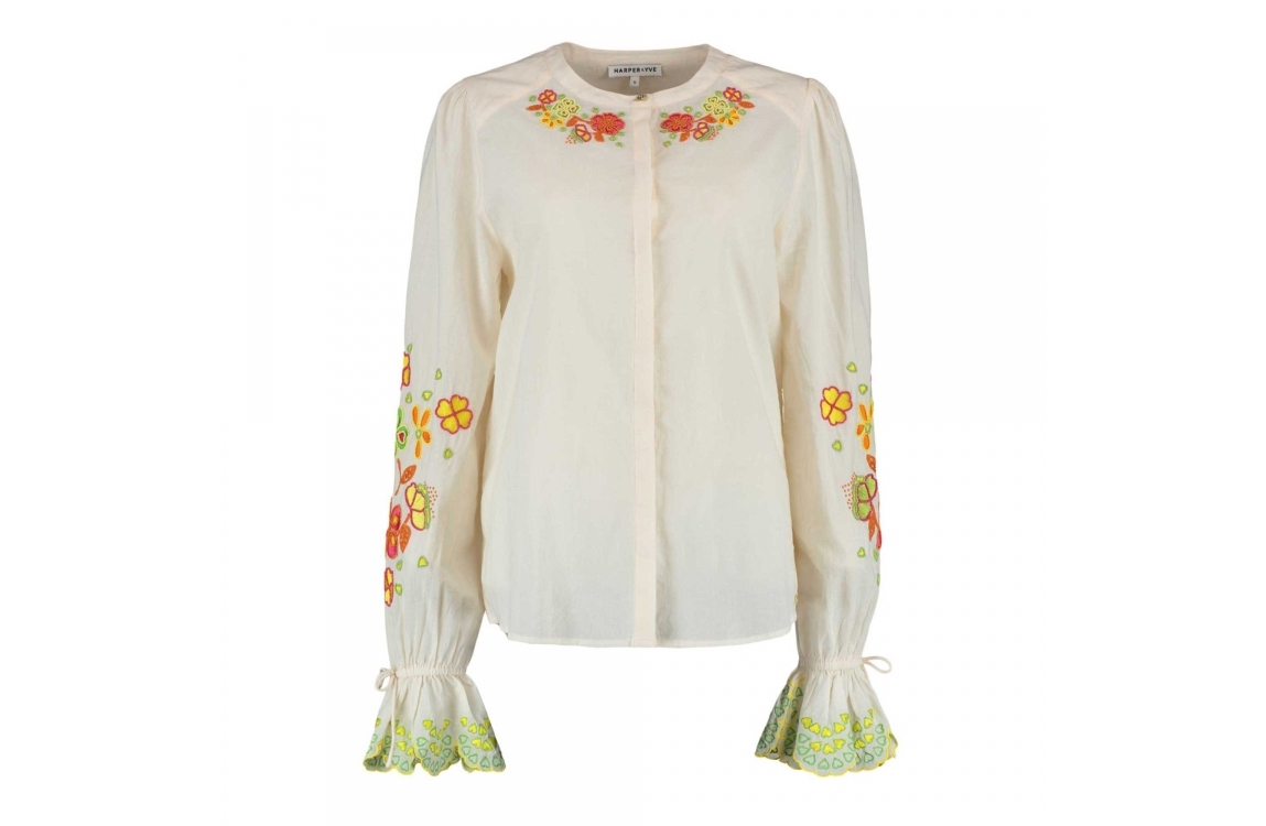 Harper and Yve blouse SS24P603. Dit rechtvallend model heeft een ronde hals en lange mouwen. Deze off white blouse van Harper and Yve is aan de voorzijde en op de mouwen bewerkt met gekleurde kraaltjes in bloemenvorm. Dit model sluit aan de voorzijde door middel van knopen en de manchetten zijn bewerkt met een sierstrik en opgeborduurde hartvormen.