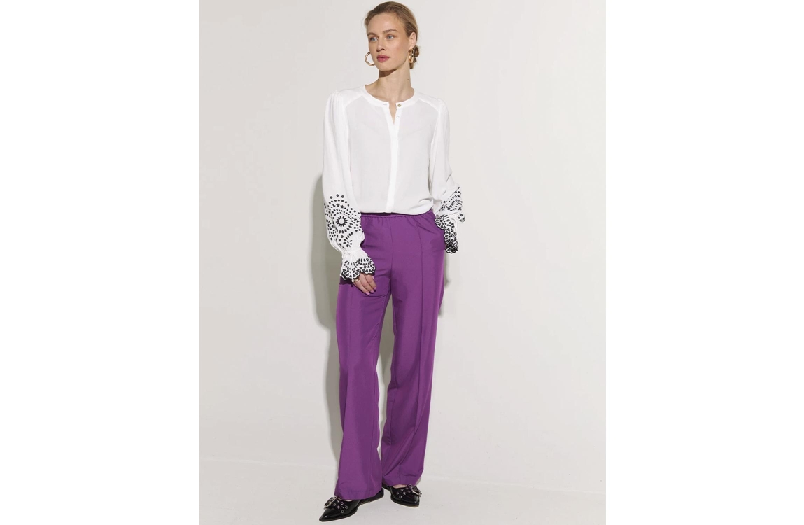 Harper and Yve broek Hana-pa SS24P111. Dit straight fit model is voorzien van een elastische tailleband en heeft lange pijpen. Deze paarse broek van Harper and Yve is uitgevoerd met schuine steekzakken aan de voorzijde en twee schijnzakken aan de achterzijde. De broek is aan de linkerkant van de voorzijde voorzien van het merkembleem 'Harper & Yve'.