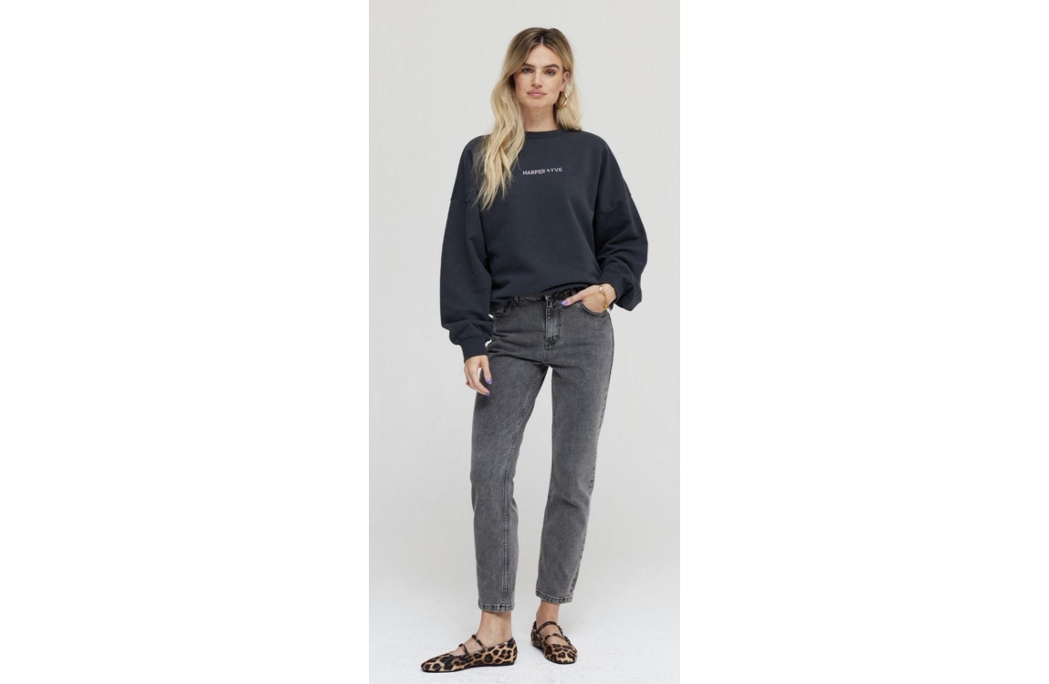 Harper and Yve jeans AW24R101. Dit mom fit sluit door middel van een knoop en rits afgewerkt met ceintuurlussen. Deze grijze jeans van Harper and Yve is uitgevoerd in een 5-pocket model.