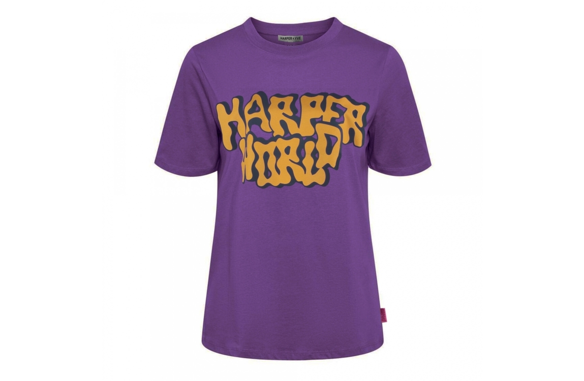 Harper and Yve T-shirt Harperworld AW24Y303. Dit rechtvallend model heeft een ronde hals en korte mouwen. Deze paarse T-shirt van Harper and Yve is aan de voorzijde bewerkt met een tekstopdruk met de tekst 'Harperworld' en is uitgevoerd in een lichte stretch kwaliteit.