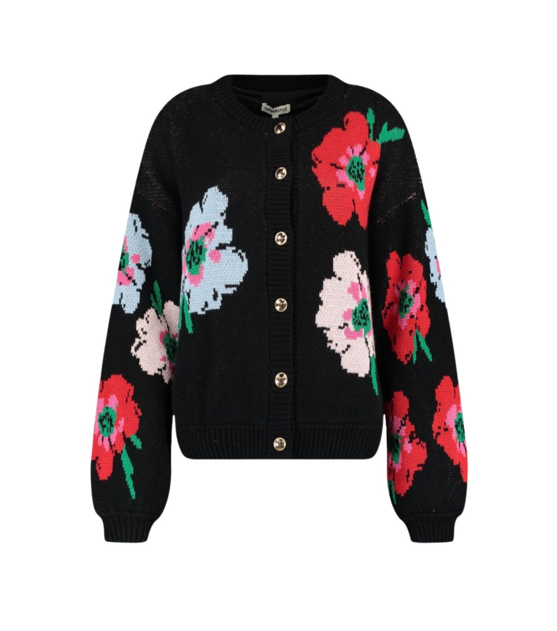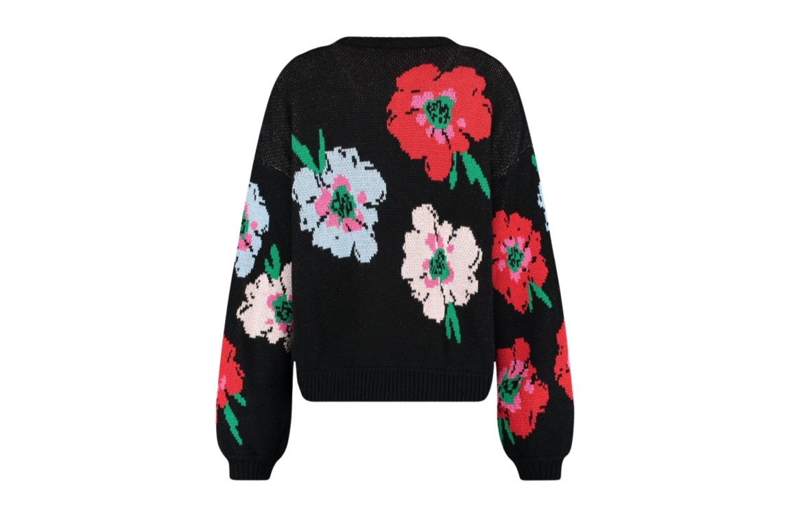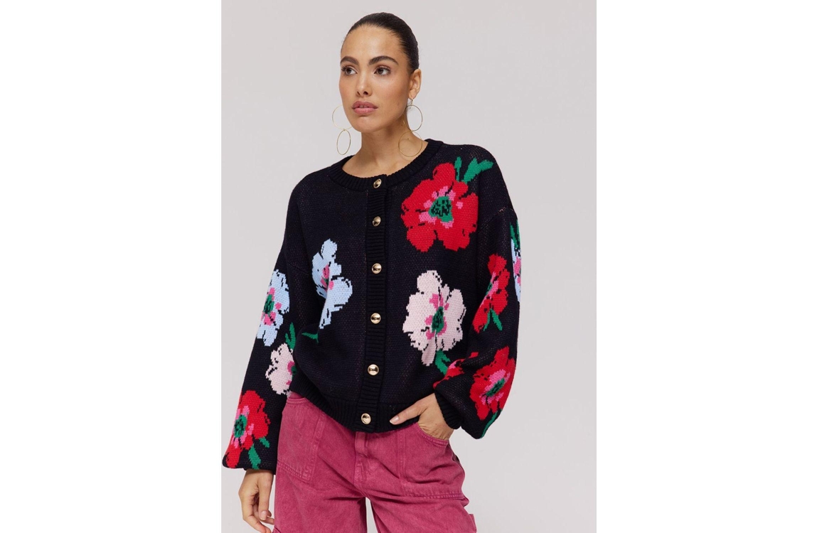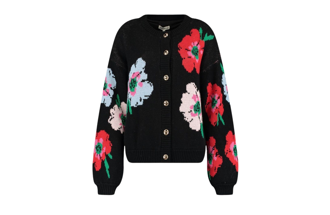 Harper and Yve JAZZ-CA 1267 multi flower. Dit wijdvallende model heeft een ronde hals en lange mouwen. Deze zwartetrui van Harper and Yve sluit aan de voorzijde door middel van goudkleurige knopen en is all-over bewerkt met een bloemenprint.