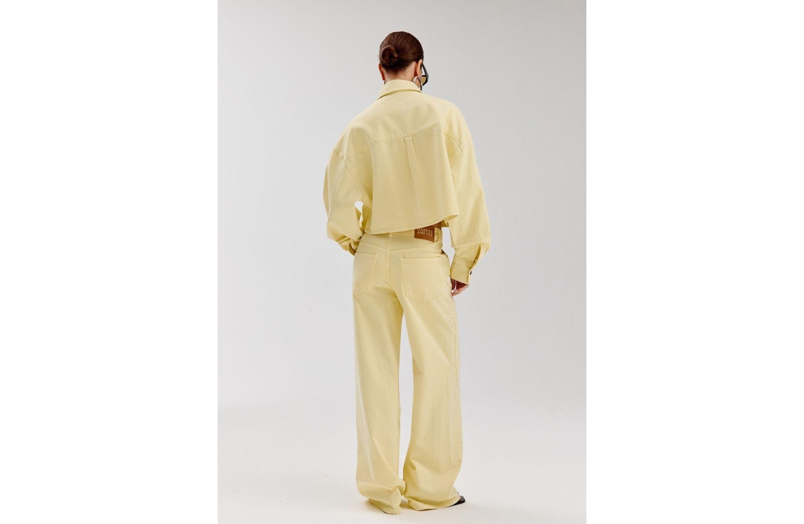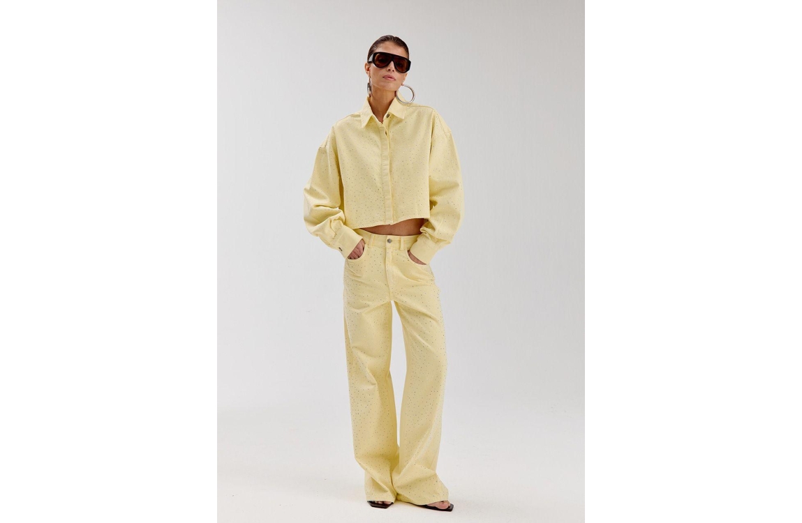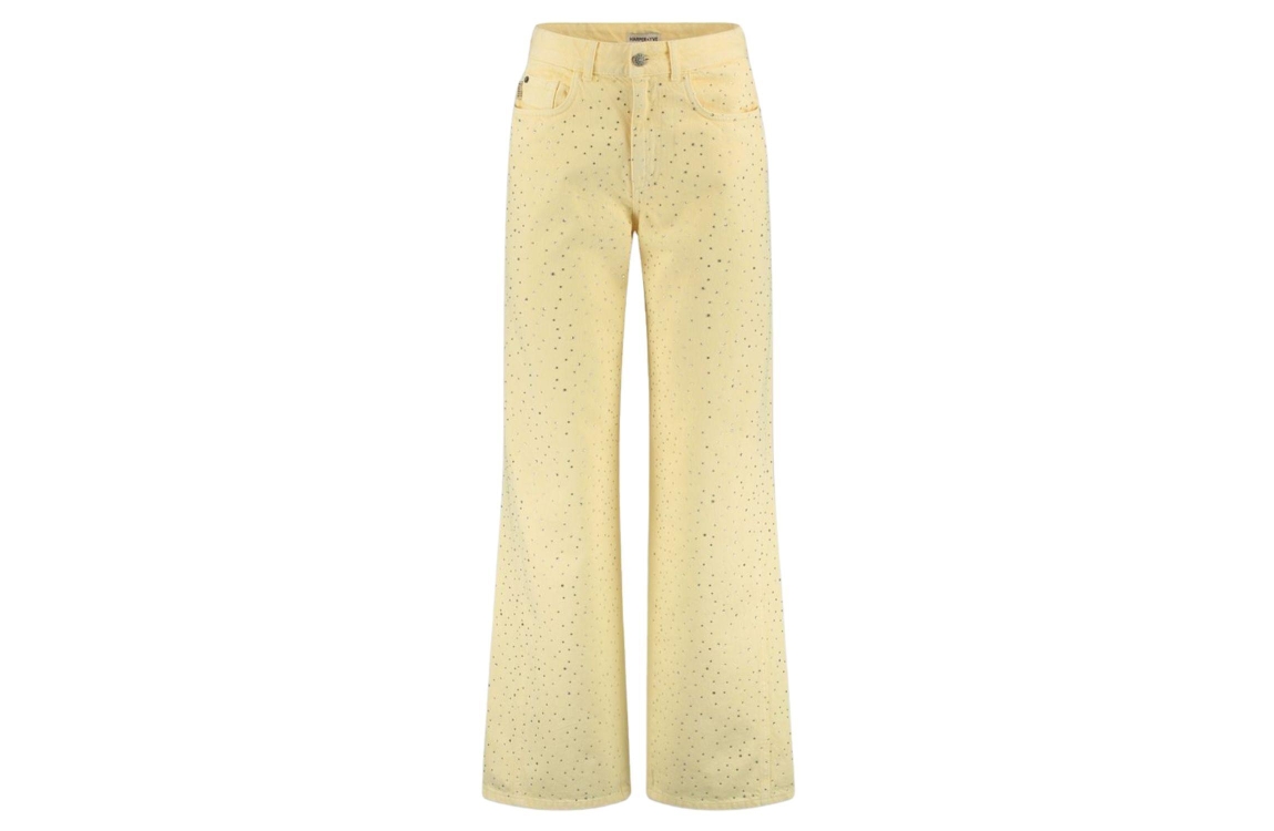 Harper and Yve MAYRA-PA 722 light yellow. Dit wide leg model sluit door middel van een knoop en rits. Deze gele jeans van Harper & Yve is bewerkt met strass steentjes op de voorzijde. Dit model beschikt over 5-pocket zakken.
