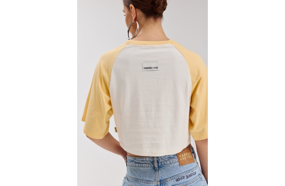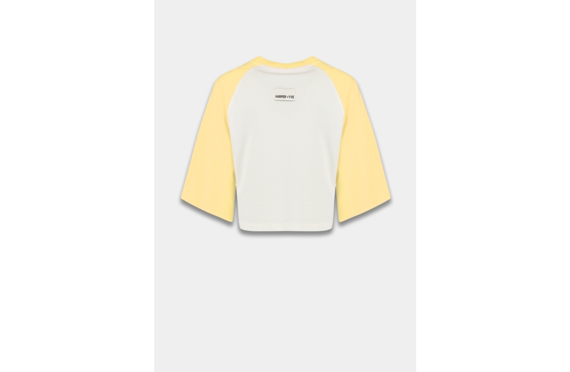 Harper and Yve MEXICANSUMMER-SS 723 butter yellow. Dit rechtvallende model is voorzien van een ronde hals en heeft korte mouwen. Deze gele top van Harper and Yve is op de voorzijde bewerkt met een opdruk. Dit model is aan de voorkant in een punt uitgesneden en aan de achterkant recht en korter.