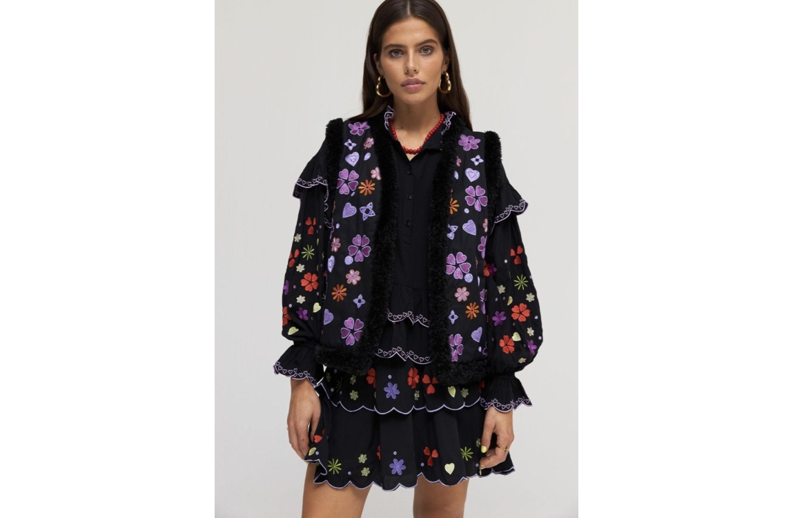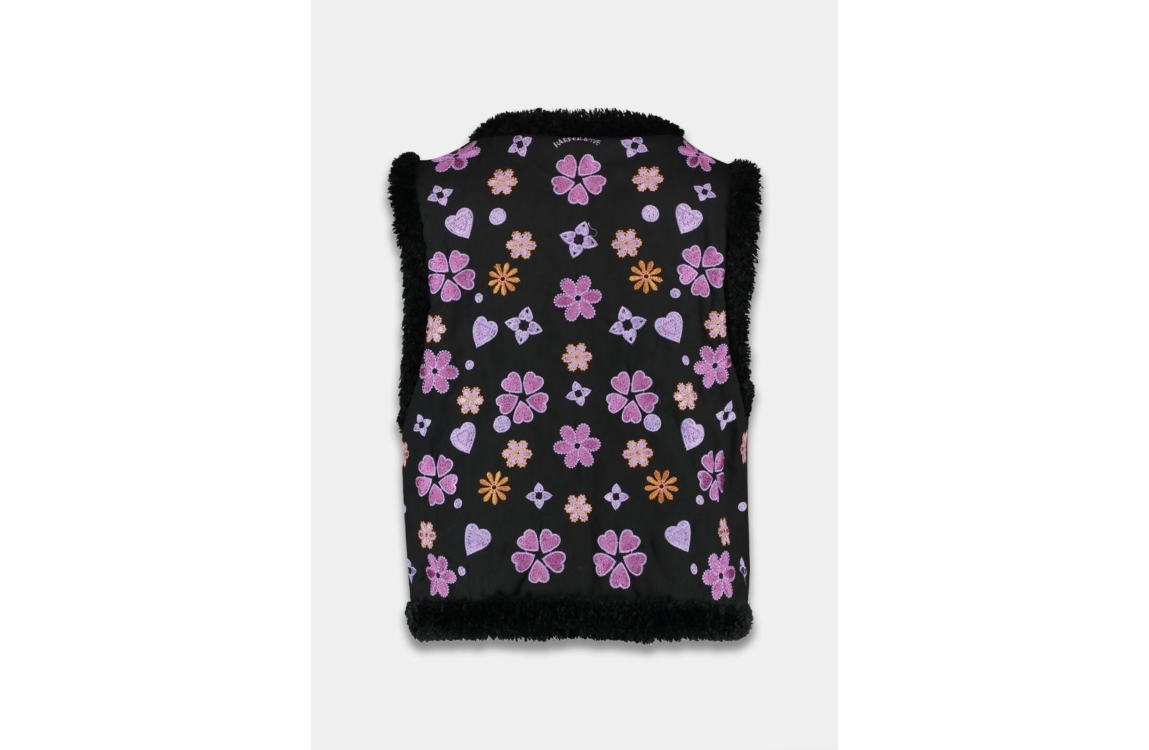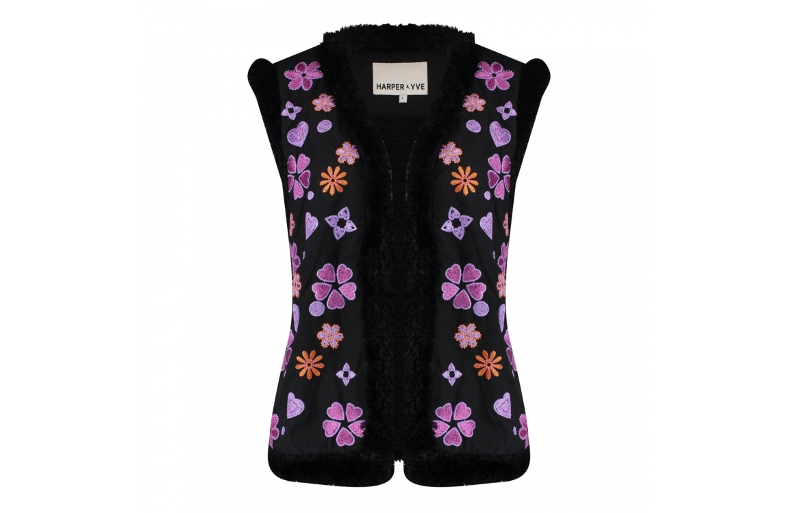 Harper and Yve gilet River AW24P203. Dit rechtvallend model heeft een V-hals en is mouwloos. Deze zwarte gilet van Harper and Yve is all-over bewerkt met opgeborduurde figuren in de kleuren paars en rood. Dit model is aan de binnenzijde en boorden bewerkt met een teddy look en sluit aan de voorzijde door middel van knopen.