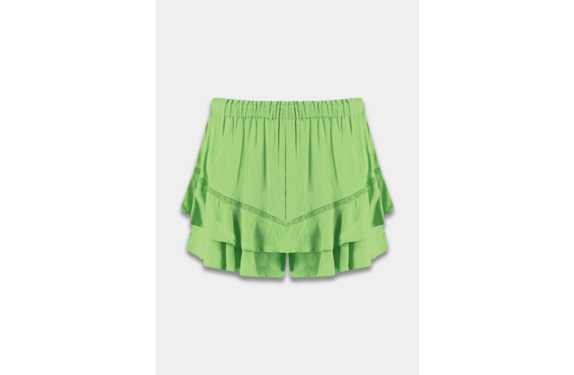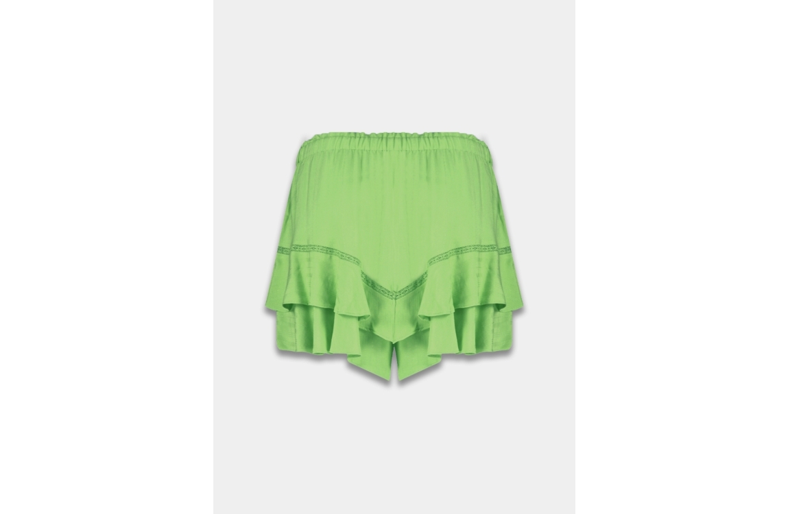 Harper and Yve rok SS24J102. Dit regular fit model sluit door middel van een elastische band. Deze groene broek van Harper and Yve is bewerkt met opengehaakte details en ruffles.